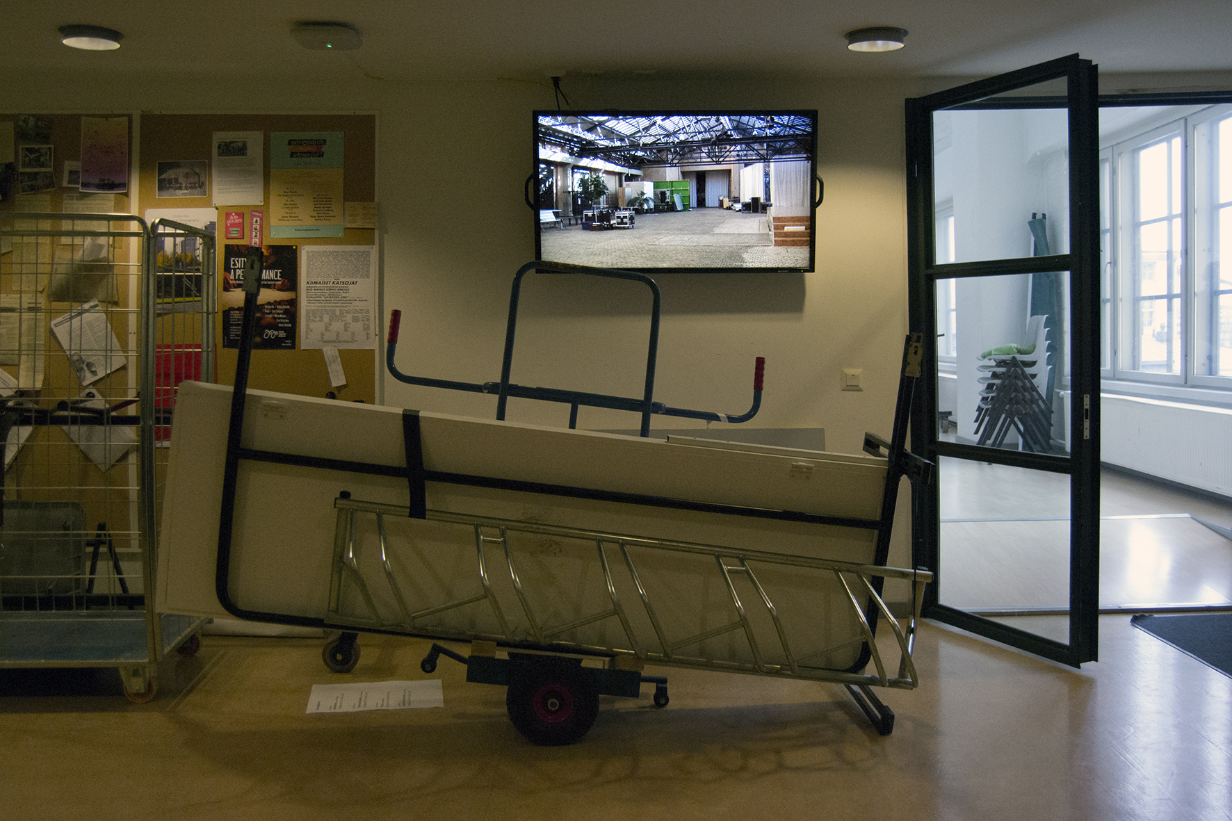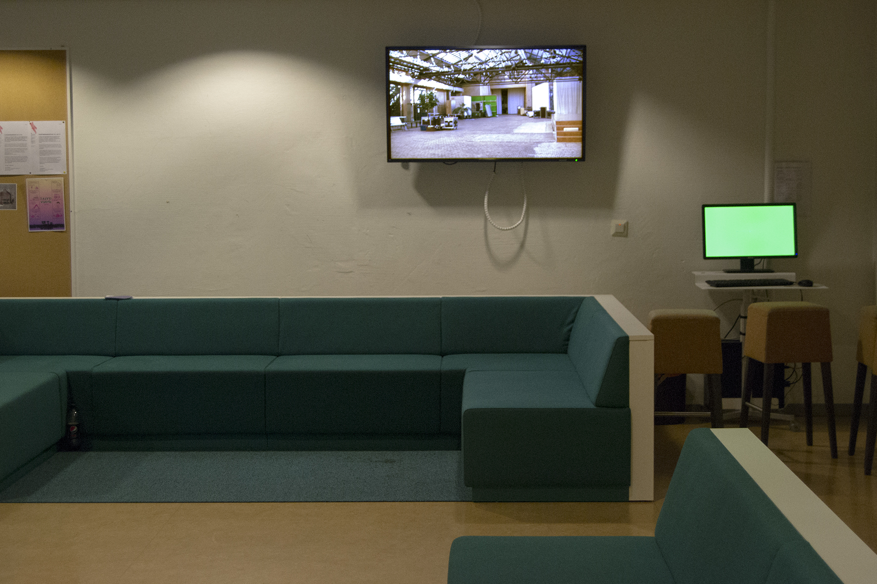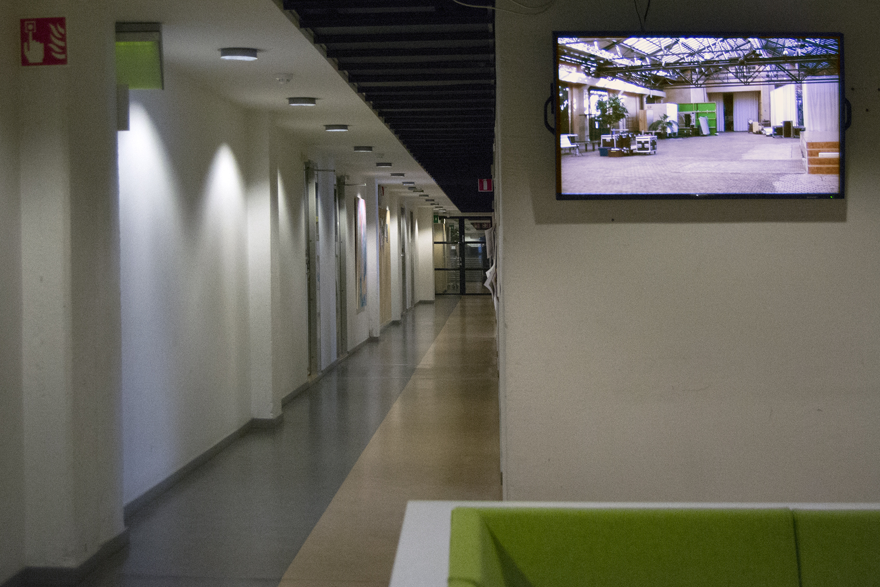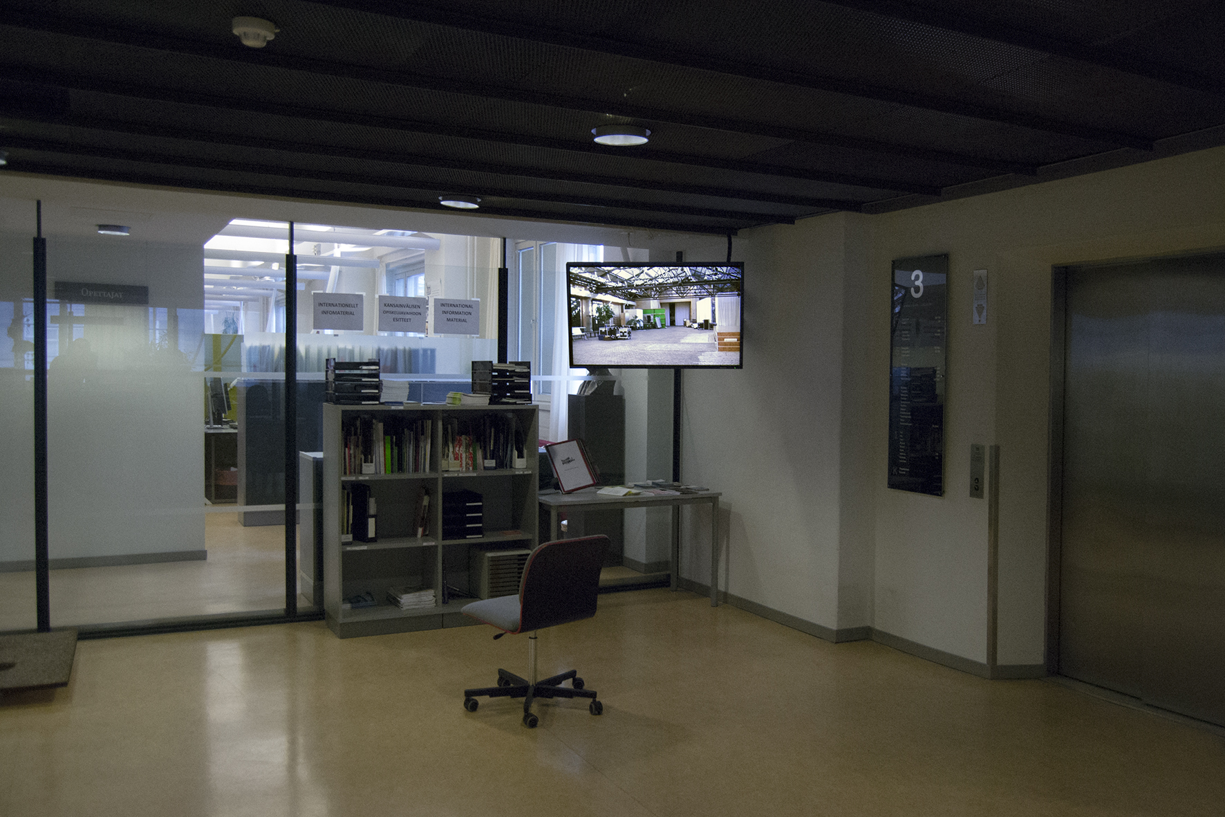 At the Theatre Academy, the viewer had the possibility to see the work on every floor and not necessarily only by the place where the video was done. This displacement brought another temporal layer to the work: the immediate perceptual connection to the materiality of the location was disconnected, so if the viewer chose to watch the work on the fourth floor, for example, s/he could then walk down to the entrance hall and see the actual place where the work was done.