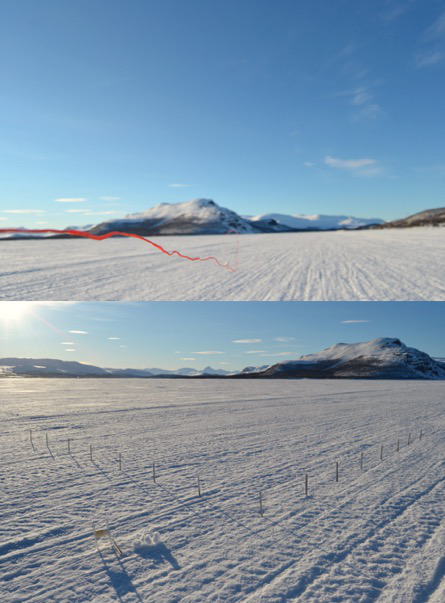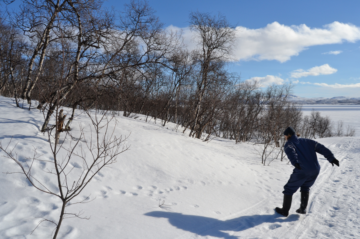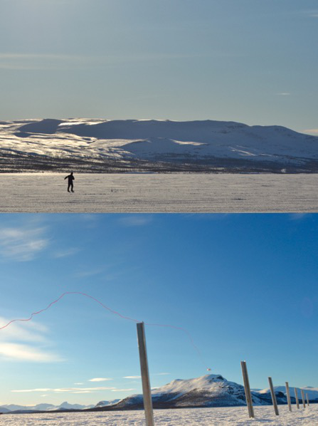 The residency operates at the Kilpisjärvi Biological Station of the University of Helsinki in sub-Arctic Lapland. The station has many statistics on its walls in the corridors. In reading them I became curious about how the surrounding movement could be turned into descriptive statistics. If statistics is seen as a capturing apparatus, I wanted to try to catch one of the relevant movements here: throwing a snowball. I took 16 metal sticks and light rope with me and went on the lake Kilpisjärvi. I built a small chart onto which I threw a snowball, which is attached to the rope.
