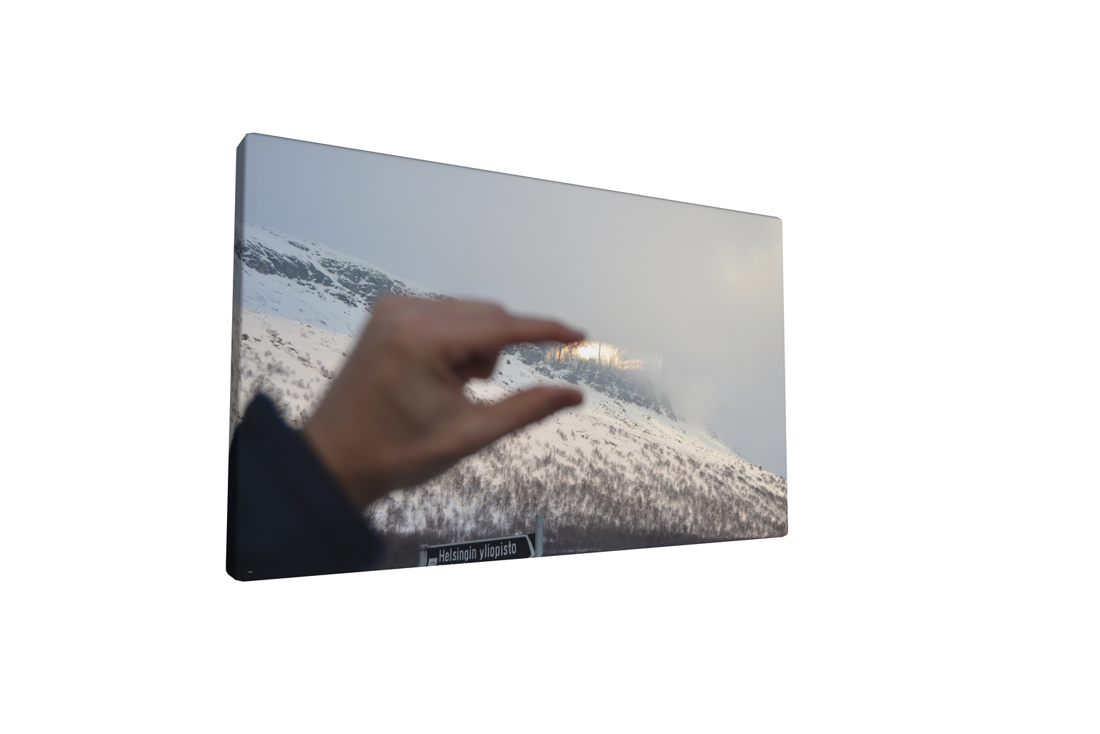 On one frosty morning in April, the icebound lake Kilpisjärvi is in incessant interplay with shady and luminous movements. I become magnetized by these movements and by the space that this play reveals. The transforming luster turns the field of ice onto a big moving threshold on the verges of shadow and the light.