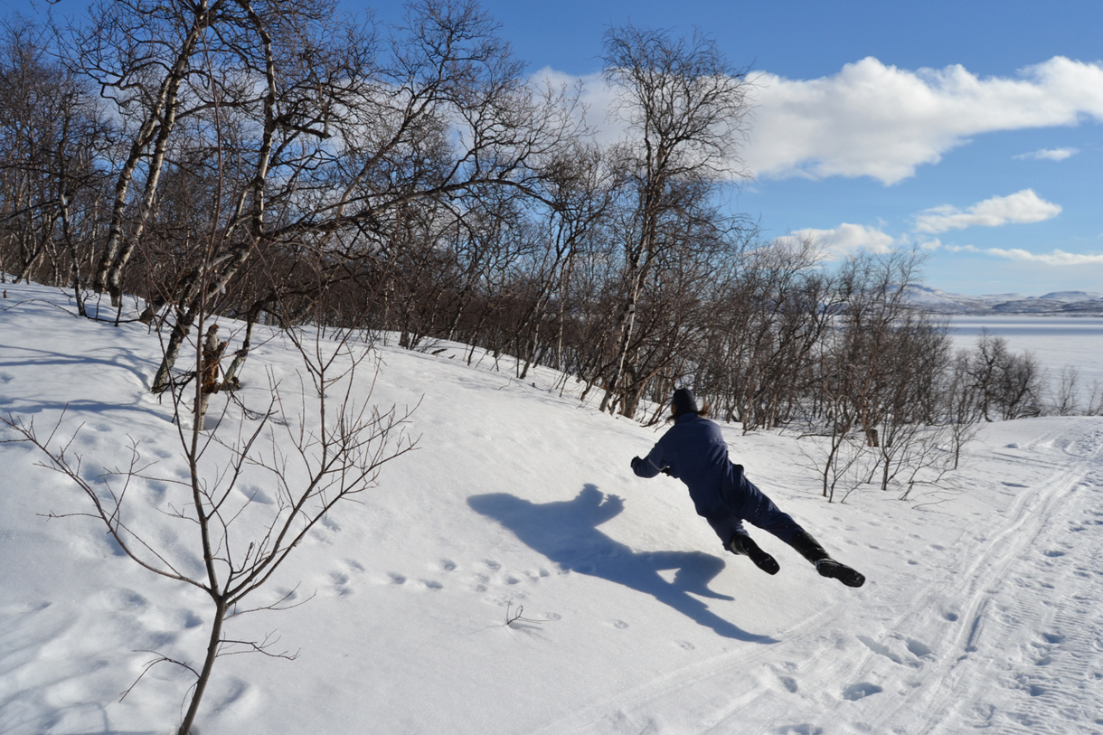 The quality of the snow determines the ways of moving about in the arctic environment. The material circumstance is dominated by the snow. I want to get closer to it, and I choose to approach the snow by jumping. The snow is hard and does not give in: it is like leaping against solid, compact, and firm material. The snow bumps into me. These white banks resist my human body.