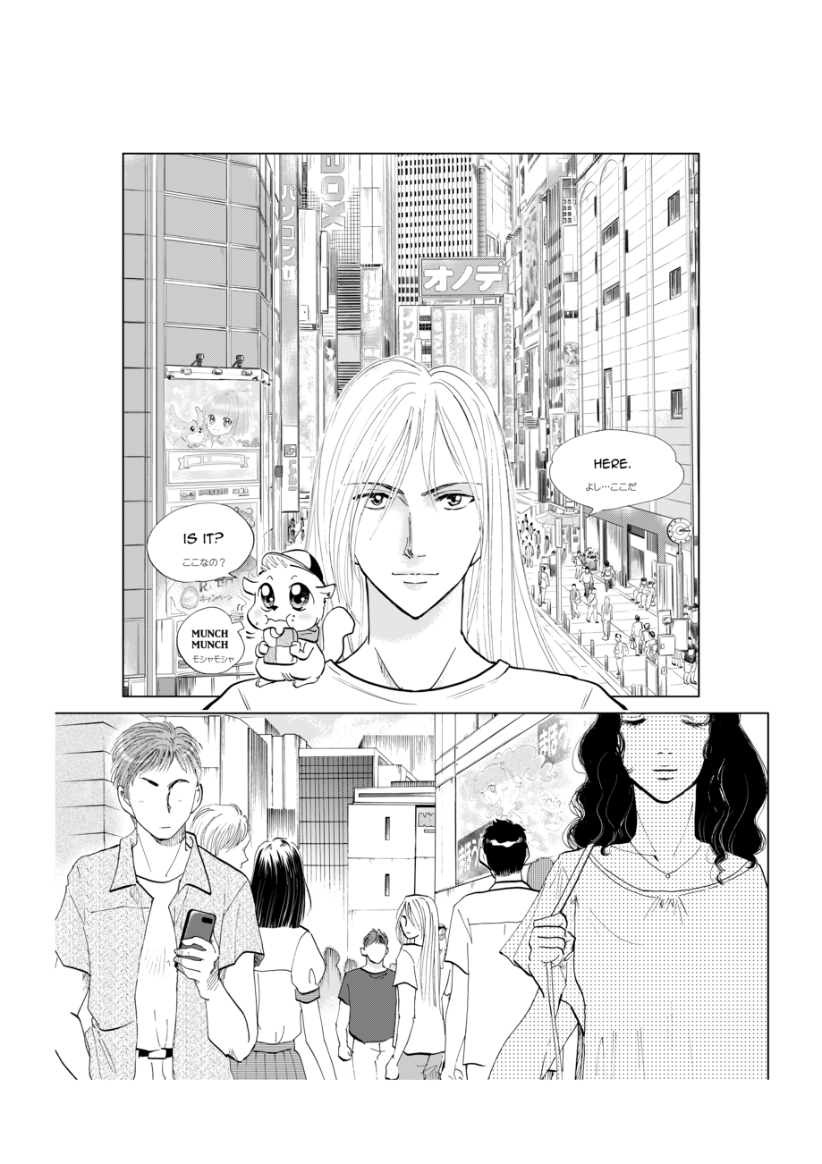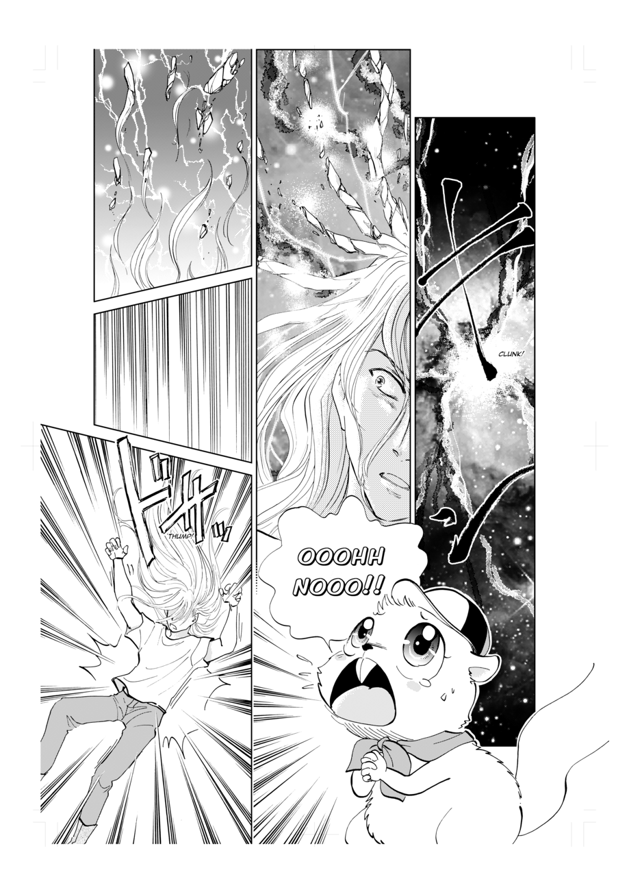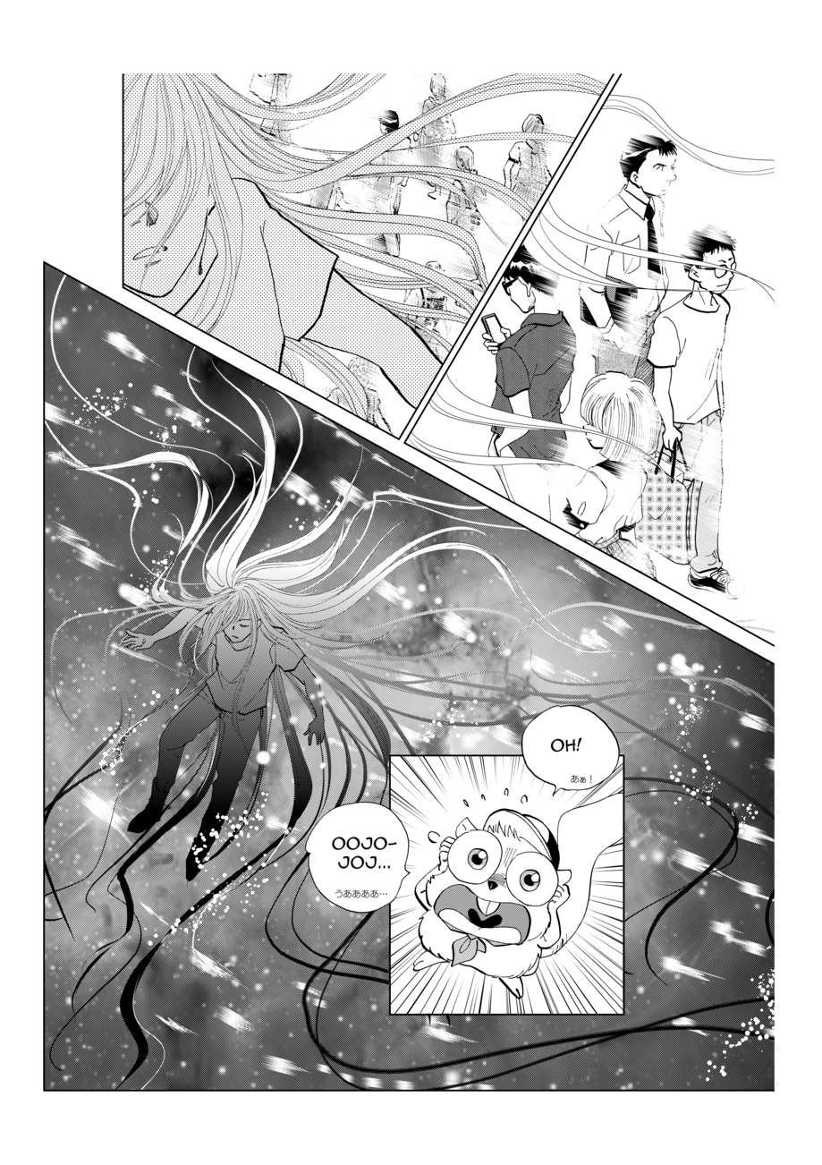 In each scene of manga, pompom connects with the location in a specific way – either by his own actions or by meeting an active agent or entity in the location. The connection causes the location’s transformation into nebula, so each scene combines the micro-scene with the galactic one by extending towards the cosmic scale of movements at hand.