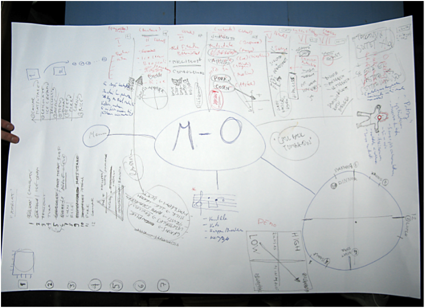 Mediasuunnittelun teorian avulla teosten syntyprosessia voidaan tarkastella kolmitasoisena: 1) mentaalirepresentaationa eli teoksena sellaisena, kuin se ilmenee tekijän mielikuvissa; 2) muotoutuvana teoksena suunnitteluprosessin kohteena; ja 3) valmiina teoksena, tulemana ja representaationa (Ylä-Kotola ja Arai 2000, 111). Omnivorella tai La Figure de La Terrellä ei kummallakaan ole yhtä taideteollisen objektin tai ainutkertaisen taideteoksen (objet d’art) kaltaista uniikkia tulemaa. Tästä johtuen sovellan ja laajennan Ylä-Kotolan ja Arain jaottelua neljännellä tasolla, joka ottaa huomioon teosten aikaan limitetyn luonteen (embedded in time) ja nostaa tarkasteluun toisistaan poikkeavat teosversiot ja esityskerrat. Jaotteluni mukaan teoksellisuus ilmenee näin neljällä tasolla: 1) Idea, 2) Projekti, 3) Tulemat, sekä 4) Versiot (vertaa myös Timonen 2004, 54).