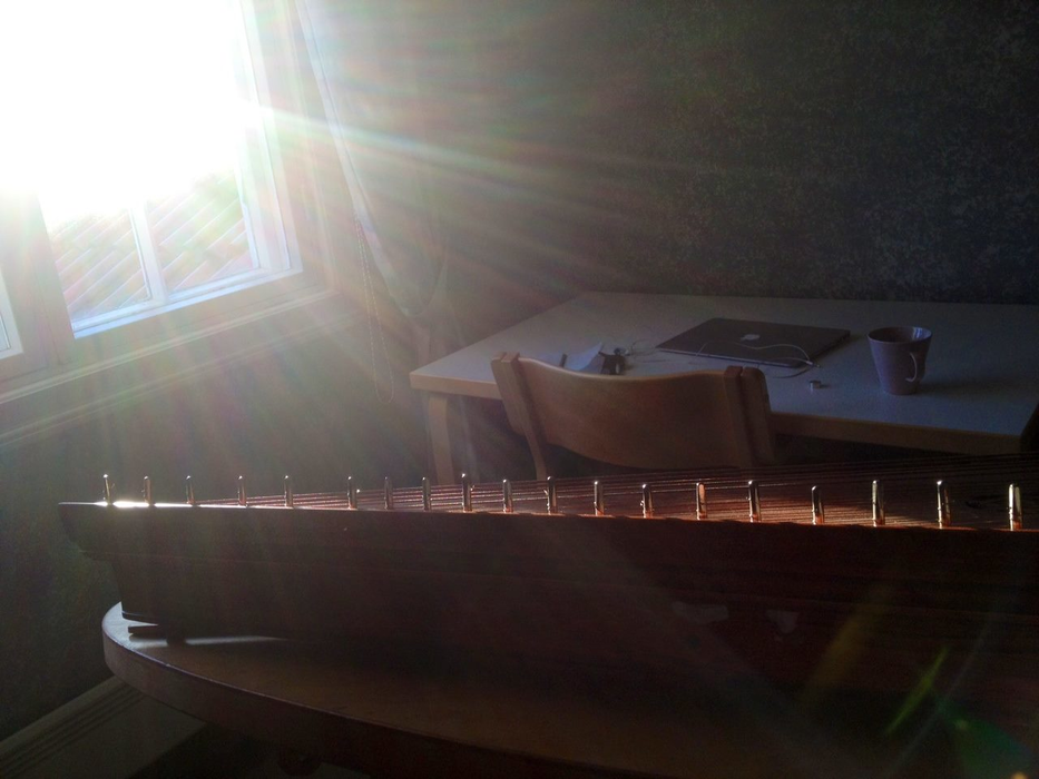 Kantele ja minä. Me, nyt. Maailma on toisaalla, kaukana. Pöydällä on kupillinen vihreää teetä ja ympärillä ääni, jonka sormeni saavat aikaan. Tämä on turvallinen ja pehmeä säveltämisen universumi, musiikkitodellisuus. Tänne ei juuri nyt kukaan muu tunkeudu.