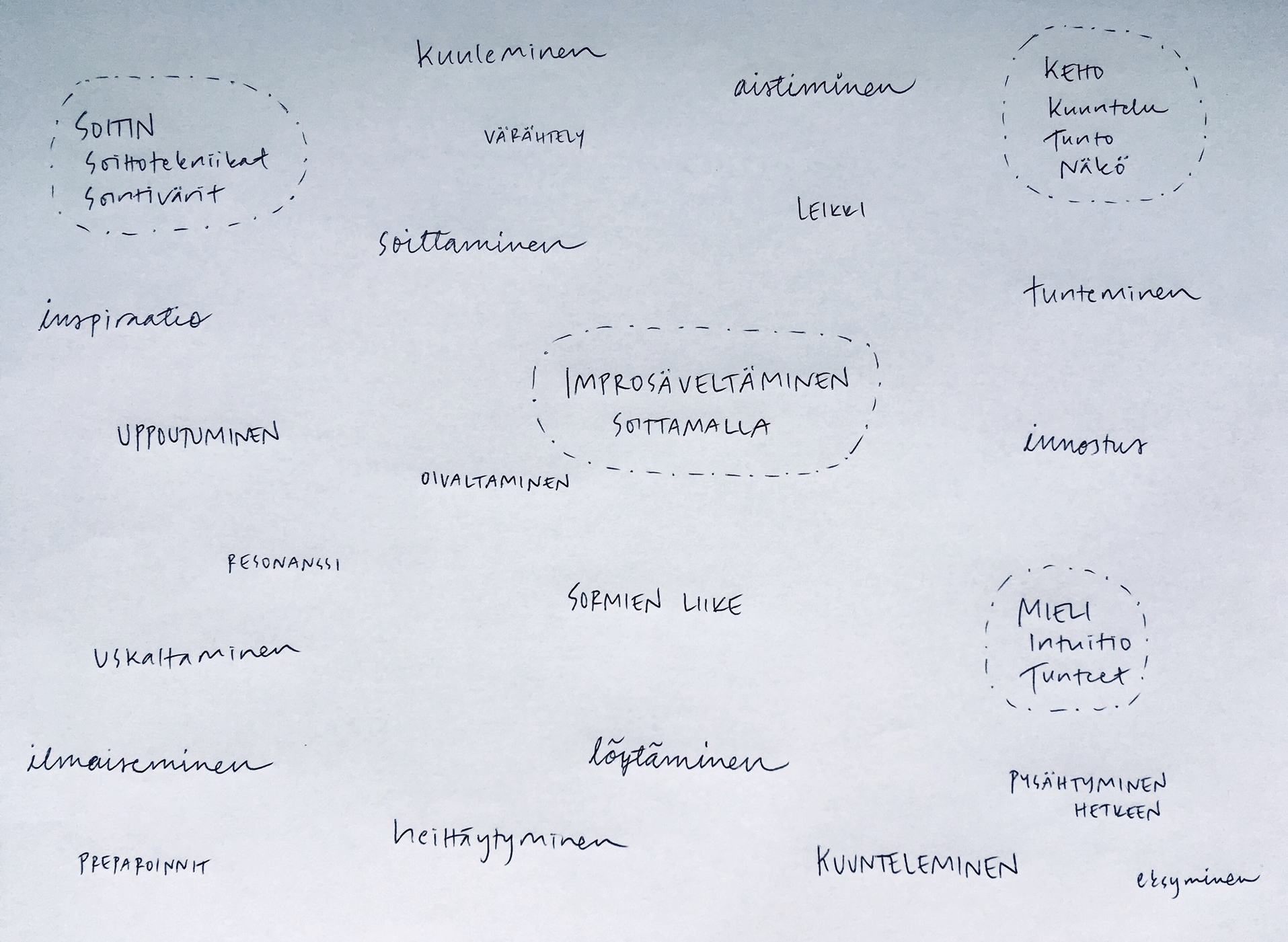 Osana taiteellista tutkimustani olen halunnut selventää itselleni, mitä sävellystyöni aikana oikeastaan tapahtuu: mikä on oma menetelmäni ja millaisia käytänteitä olen kehittänyt työskentelyyni? Säveltämiseeni liittyvien elementtien joukosta olen nyt saanut kirkastettua ne, joita pidän tällä hetkellä keskeisimpinä. Olen päättänyt kutsua säveltämisen tapaani improsäveltämiseksi soittamalla. Musiikillinen improvisaatio on työskentelyni perusta, sillä se on väline sekä ideoiden etsimiseen että sävellysten työstämiseen. Soittaminen on sanaparin itsestään selvä osa, sillä sävellän soittaen ja taustalla on tiivis suhde tiettyyn instrumenttiin. Suora vuorovaikutus soittimen kanssa saa aikaan luovia impulsseja ja instrumentiltaan voi myös kysyä: kuka sinä olet? miltä sinä kuulostat?(Schwabe 2016: 365). Oman kokemukseni perusteella on todella innostavaa lähestyä soitinta kuvitellen, ettei tiedä miten sitä tulisi soittaa. Tämä on synnyttänyt uusia teknisiä oivalluksia, kuten kanteleen soittamisen kielet kohtisuorassa itseeni nähden (video alla). Toisinaan on vaikea erottaa, kumpi syntyy ensin: musiikillinen idea vai soittotekniikka. Tästä voi kehkeytyä positiivinen itseään lietsova kehä, jossa soittotekniikka saa aikaan musiikillisen idean (tai toisinpäin), joka johtaa uuteen soittotekniseen oivallukseen ja tämä taas johdattaa uuden musiikillisen vihjeen äärelle (Bailey 1992: 100). Itsekin olen kokenut edellä kuvatun kaltaisia inspiroivia hetkiä, joiden aikana erilaiset impulssit ruokkivat toisiaan.