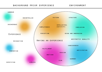 The theoretical background is built on the concepts of aesthetic engagement (Berleant 1991) and aesthetic experience (Dewey 2005). In my research, I apply Dewey‘s (2005, 37) concept of aesthetic experience, focusing on the idea of having an experience (see Figure 2.). Dewey explains that an experience is a flow from something to something, and in it there is no self-identity of the different parts of it but all the parts lead to one another, and as a part carries on what went before, each gains distinctness in itself (ibid. 38). Dewey says that the aesthetic denotes the consumer’s rather than the producer’s standpoint (ibid. 49). He makes the distinction of “artistic” referring to the act of production and “aesthetic” to that of perception and enjoyment (ibid. 48). Comparing the perception of the consumers and makers it can be simplified that the maker holds both artistic and aesthetic perception towards the art object and the consumers perception is more attached to aesthetic without the experience of making.
