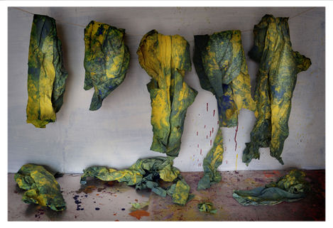 PROPOSAL. Paper soaked in acrylic paint, screwed up, trampled upon,swept and thrown, whilst damp, into a heap in the corner of a room.