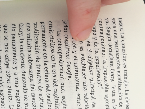 And so it begins in Spanish, underlined in red because it is spelt wrong according to Word. But a conjunction, anyway, is not about a direct idea to be decoded—(I should translate it to English, but I won’t. It exists in the prologue of a Spanish version printed by the Buenos Aires based publisher Caja Negra. It may or may not exist in English. It exists here as an and and y)—A conjunction instead is a starting point of discovery of other.