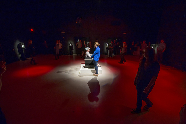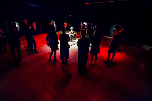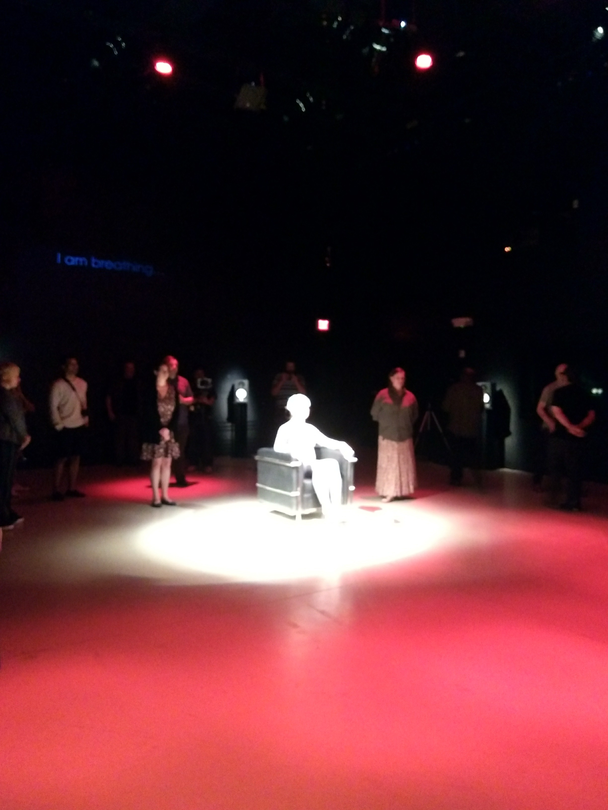 References to agency and interpersonal interaction are specific to the fact that the audience experiences the piece from INSIDE its perimeter, and actively influences the data generation by interacting with the performer.