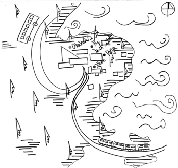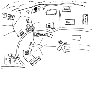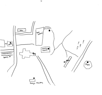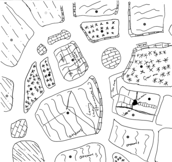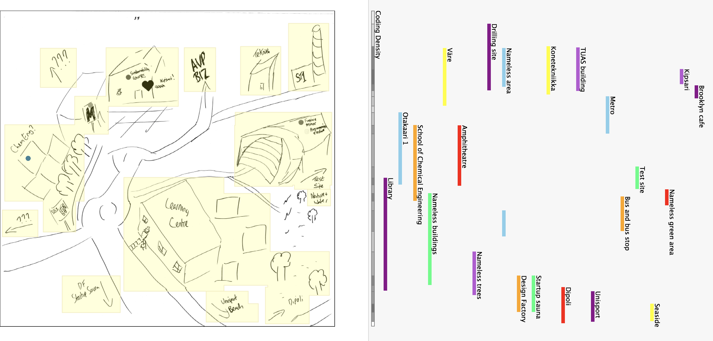 Despite the maps being messy and sometimes unclear, my own good knowledge of the area allowed the recognition of most of the markings on the maps and their subsequent categorisation into a code-book. Additionally, notes and markings made by the students helped identify elements on the images. If the text was more extensive than a single name or location, it was transcribed into a memo and stored in connection with the map which it came from. An example of a coded image is shown in Figure 3.