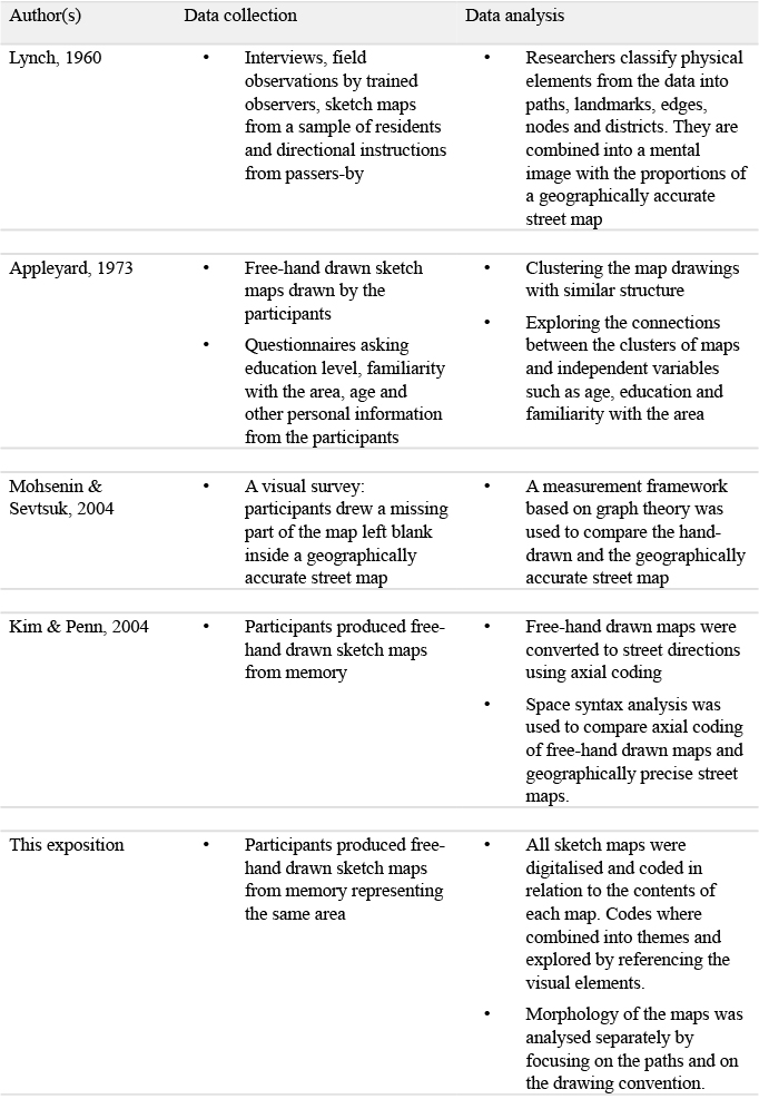 In the context of urban design, the relationships between physical properties and human behaviour are more important than the cognitive processes behind them or than the personal or group narratives. Researchers try to connect the mental representation to the existing geometry of space, analyse the distortions or find common patterns among groups of people of the same age or gender. Despite the simplicity of the task (freehand drawing from memory), analysis of this data presents a challenge due to its messy and unstructured nature. Hand-drawn maps are often too diverse and complex for systematic analytic procedures. When working with maps drawn from memory, researchers usually come up with a method that will reduce their complexity to a more abstracted representation, comparable or measurable. Table 1 presents a range of data collection and analysis procedures from different studies.