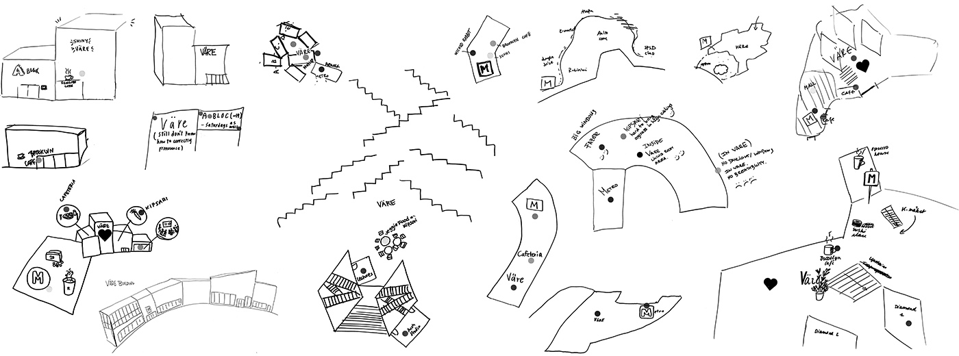 The mental image of Väre has a vague and loosely defined shape, despite a structured modular organisation. The building is like a container for places inside it, such as cafes and shops. It is remembered as a facade from the outside and as an intricate pattern of staircases inside. Most of the markings on the maps of Väre relate to experiences of food and coffee, with one related to windows and lack of air inside. Metro exists on almost every image of the collage, never as a space, but merely as a symbol. Container metaphor might have something to do with the size of the building, which is close to the size of a block. Smaller, more human-sized entities such as cafes become the supporting nodes of the mental image.