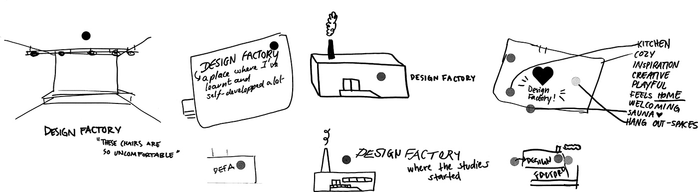 Design Factory is portrayed in several ways: first, through its laconic factory-like form, second, as a space for events where the stage is a dominant element, and, lastly, it is mentioned as a place for significant memories. One person mentions that Design Factory is a place where they have learned and self-developed a lot. Another person talks about the contents of the space: the cosy kitchen, the inspirational, creative and playful atmosphere, the sauna and hang-out spaces. The very presence of Design Factory on so many of the mental images is unexpected: the building is located some distance from the main activities and transport connections, and it is not on the way to anywhere. Given that Design Factory does not have regular classes that students attend but rather holds one-off events, it must be quite memorable to appear in so many representations of Otaniemi.