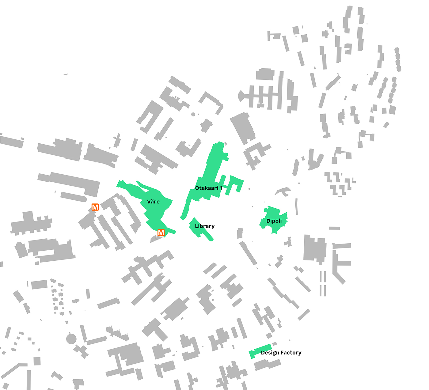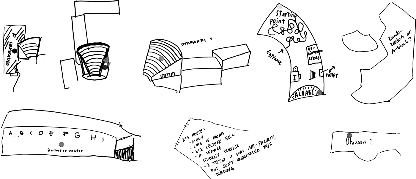In total, the mental maps had 20 different buildings represented on them. If we compare this number to the actual number of the buildings on campus (49), then only 40% of them were mentioned. That said, even within that 40% the distribution of the buildings was not even: the same five buildings were mentioned in 69% of the cases (Figure 5). These buildings were Väre (the home of the School of Arts, Design and Architecture completed in 2018), Otakaari 1 (Bachelor centre designed by Alvar Aalto as the main university building), Learning Centre (former library transformed into an open space for learning), Dipoli (a former student union building designed by Reima and Raili Pietilä) and Design Factory (a former industrial building).