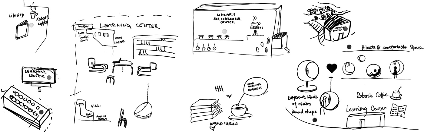 What is striking about the representations of the library is how different they are from Väre and the Bachelor centre, although those buildings are only 3–5 minutes away. When students draw the library, they concentrate on the interior spaces. These spaces are filled with books, different chairs (including those with the round shape), and coffee. These representations convey an embodied experience of being inside with a compact yet multi-sensory environment designed for various activities. The form of the building becomes secondary to its content, which has a special meaning for the students.