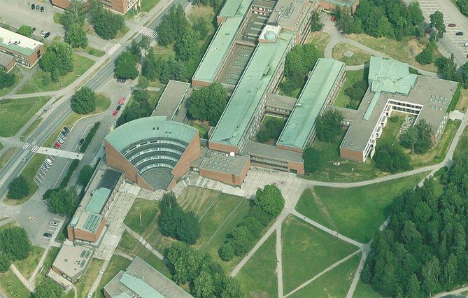 With a size similar to Väre, the Bachelor centre building is structured in a different way, merging with the landscape that surrounds it by means of descending terraces. In most of the mental images Otakaari 1 building appears in the form of its most distinct physical element, an amphitheatre, which dominates the landscape. Apart from this element, the building is portrayed through the contrast between the round shape of the amphitheatre and rectangular shapes of the building’s wings. The interiors of the building do not not have many distinct elements. One of the mental images represents Otakaari 1 as a maze, referring to the experience of getting lost in a complex building. Another image refers to it as a "messy big house" which the author of the map does not understand.