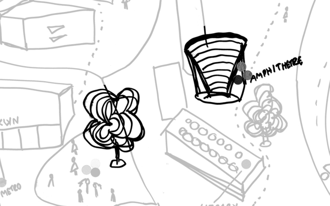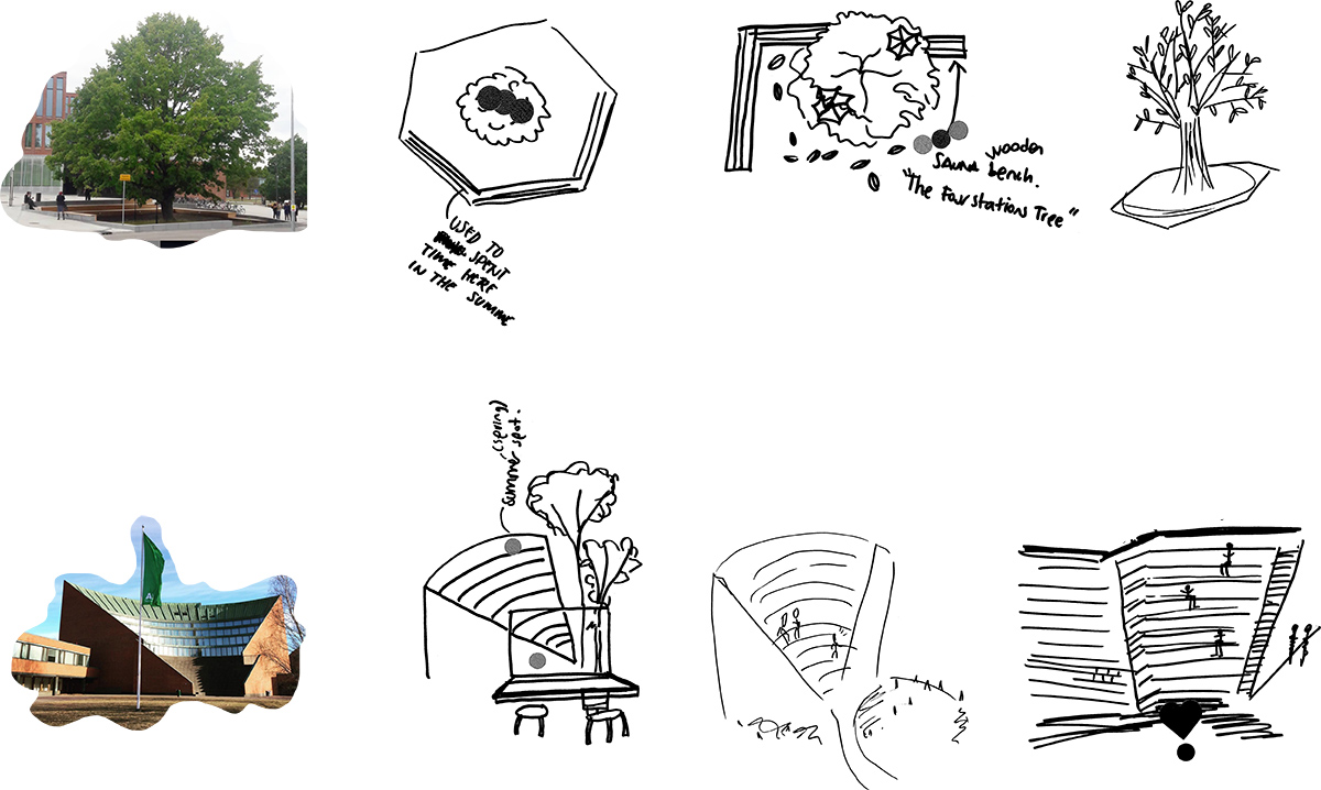 Among the outdoor places, there were two distinct elements that were repeated on many maps: the amphitheatre, which is a part of the Bachelor centre building (shown on 23 maps), and the big oak tree in front one of the entrances to the Väre building (shown on 15 maps). These elements (Figure 11) were usually exaggerated in size and often had notes attached to them. Both of these elements have a formal significance: the tree stands out from the built landscape, and the amphitheatre has a clear historic reference to classic architecture, uncommon for the rest of the space.