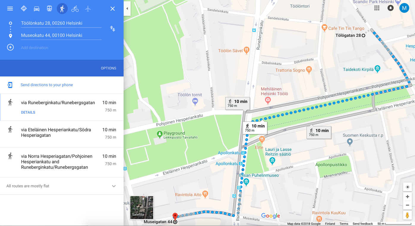 Route finding tools give us two things: descriptions on how to get A to B on the left-hand pane, and a map with an overview on the right: