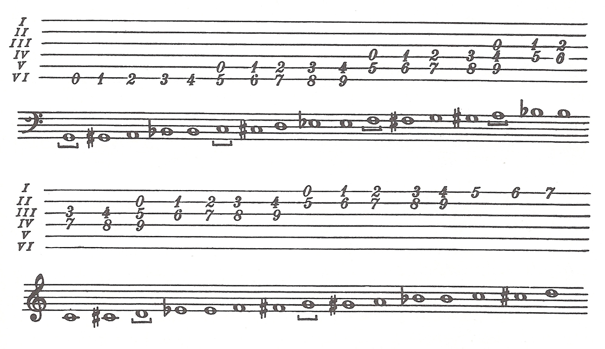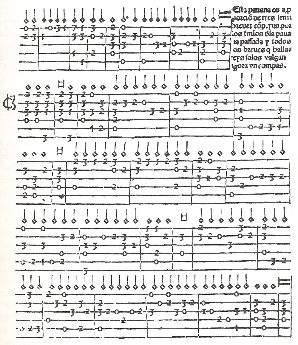 Next we look at similar processes in music. The left-hand picture below is a tablature notation for the lute. In the right-hand picture, we have information about how to decode it. We see six horizontal lines (in both pictures) on which we have numbers (mostly 0 to 3 in the left picture). These horizontal lines denote strings to be plucked (in the ascending order where the lowest line means the lowest string and the top line the top string); the number ‘0’ is the open (un-fingered) string note, which has the longest length of the string for vibration; the numbers from 1 to 9 show ‘positions’ where fingers (those of the hand that holds the ‘neck’ of the lute) press the strings to shorten the length of the strings for vibration. Following the cues given in the right-hand picture, you can decipher the numbers into notes on the lute. Then you play these notes in the rhythms written on the top of the lines for each vertical set of numbers. This notational system may appear to be an unnecessarily complicated approach to playing music to some readers. But the specificity of the instruction was of paramount significance in the age when no standardized notation was available. The specificity of the musical notes that are being communicated had to be derived from the specificity of a physical instrument as a concrete reference point.