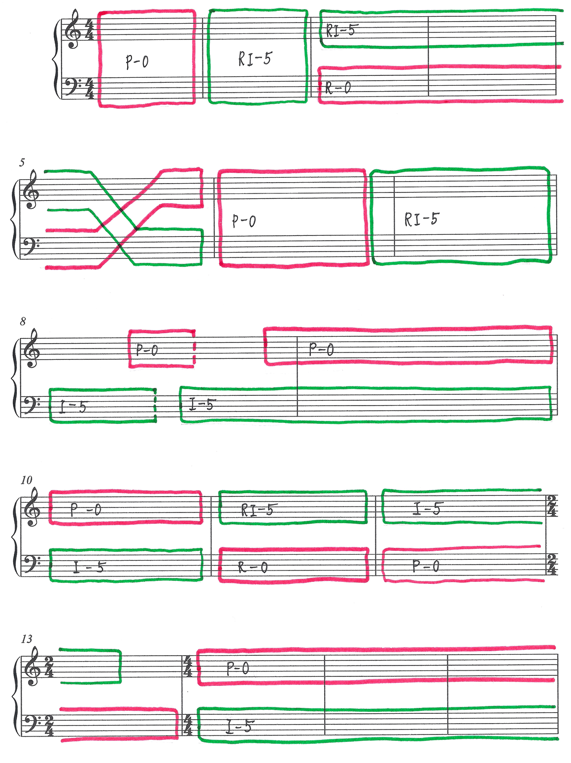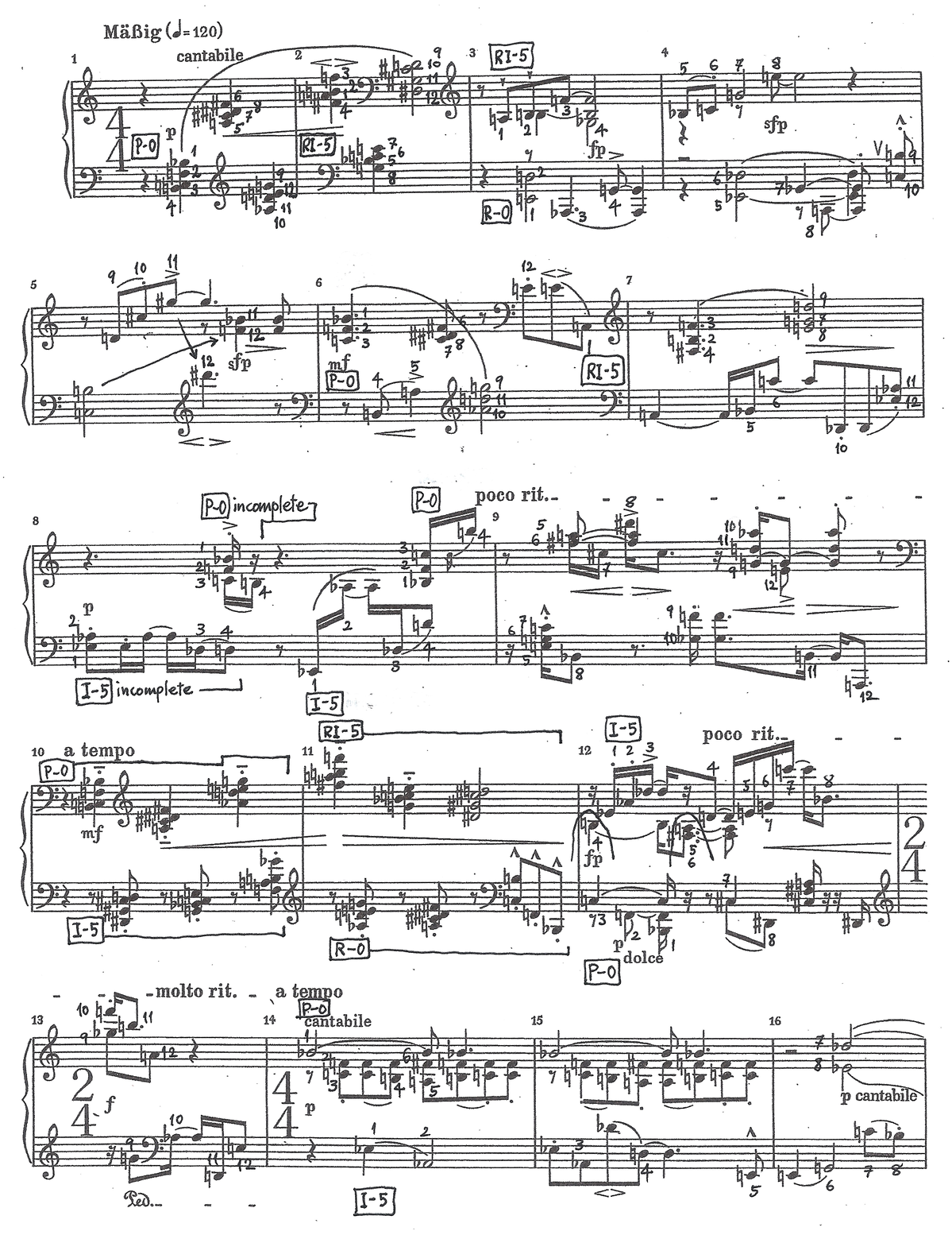 The left-hand side is the notation with the annotations identifying each pitch-class (numbers 0 to 11); the boxed labels such as P-0 (prime series at the root position) and RI-5 (retrograde inversion of the prime series at the fifth degree) denotes one type of variation made on the ‘prime series’ P-0. The right-hand side is a graphic representation of how these two series combine to constitute the musical form and fabric. Serialism conceives musical structure as a generative process: the technique is a means to both create and articulate a musical drama.