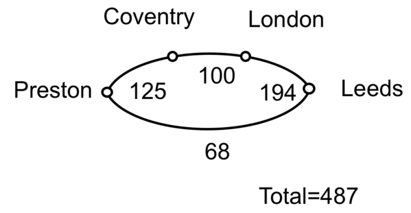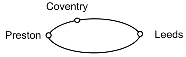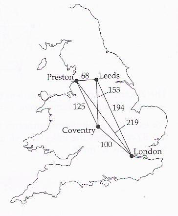 Step 1 Choose any city and find the path of least distance emerging from it. Draw the corresponding two cities as points and join them by two lines, to form a cycle. [I have chosen Leeds as a starting point.]