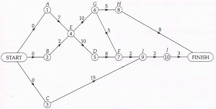 Rather than delving into the adoptive use of this algorithm, a quick survey of other available models is worthwhile in order to understand the breadth of the concept of combinatoriality as applicable tool in practical situations. Another useful model is that of critical paths. Critical path is an optimum route that is taken while ensuring all the identified tasks are completed. Here is an example of an activity network.