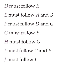 First we have a list of activities and durations. We also have rules of precedence that outline which activity must follow which one.