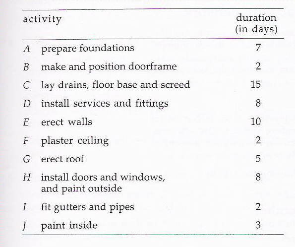 An activity network can be used to find an optimum schedule for a project with a number of tasks. Here is an example of a building construction project. In this circumstance, tasks are called activities.