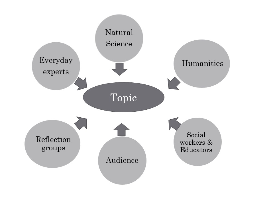 One other ofset was the wish to include as many perspective as possible about the topic. Often when we read newsfeeds, we scroll down on Facebook or other sources of information, just reading headlines. This is where we get information from I was the above model is a suggested way to get deeper and varied information on the different topics. Often, in the practice that I come from, we say: ‘I want you to feel like this. This moment I really want you to get an emotional reaction, and at the end of the play I want you to have this certain understanding when you walk out the door’. I am interested in how it is possible to have a topic and different voices around this topic so the audience becomes their own editors in making up their minds instead of being given a certain understanding.