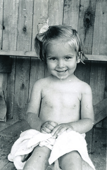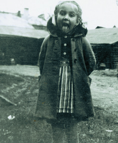 Vaikka visuaalisen työprosessin alussa kuvastooni kuului useita valokuvia kahdesta vanhimmasta esiäidistäni, huomasin lähes jättäneeni kyseiset naispolvet pois näyttelyyn ripustamistani keraamisista töistä. Visuaalisen työprosessin päätyttyä tein myös huomion, että lähimmäksi naiseuden peilikseni sijoitin näyttelyssä äidinäitini. Näyttelytyöt (kuva 4) esittivät hänet rinnallani sekä lapsena, nuorena neitona (kuva 5) kuten myös keski-ikään ehtineenä naisena. Sen sijaan äitini kanssa en näyttelytöissä tuntunut kykenevän dialogiin juuri lainkaan. Itse asiassa huomasin jättäneeni aikuisen äitini pois koko näyttelystä. Työni esittivät hänet ainoastaan sellaisten kuvien välityksellä, jotka oli otettu hänestä lapsena (kuva 6).[ii]
