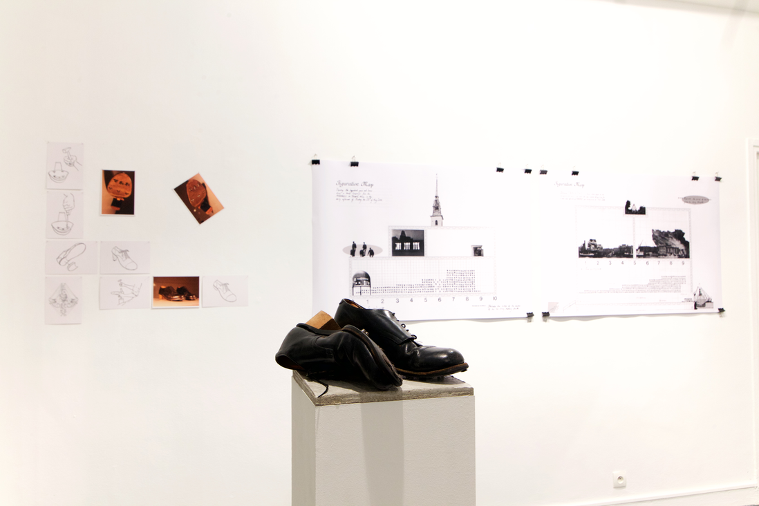 Lawrence Abu Hamdan, Marches, 2005 – 2008. Pair of customized shoes, 20 print works, audio. Variable dimensions. Installation view, Concrete Cities, mor charpentier, Paris, 2016. Courtesy mor charpentier and the artist.