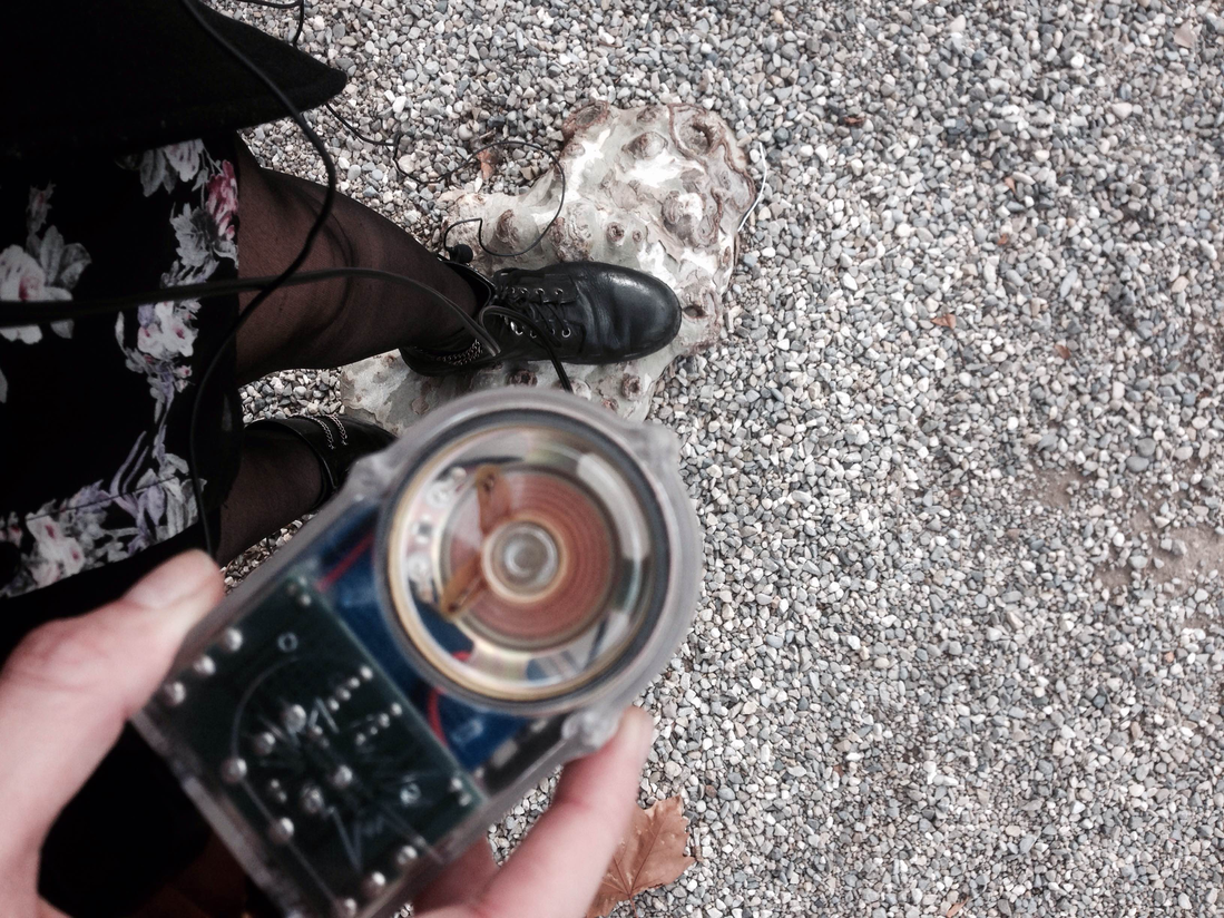 SchuhzuGehör_path of awareness, in particular, is a series of site-specific walks that has been developed in different cities around the world, investigating their structures, their architectural and atmospheric qualities as well as their walkability. In 2015, katrinem was invited to Marseille for a residency focused on developing a path for the Mobile Audio Fest.[4] During the residency she studied and explored the Belle de Mai borough by walking daily in the area with particularly resonant shoes and observing local walking habits – how the inhabitants use urban space, how they walk, how they relate to urban elements such as walkways, crossings, traffic lights, etc. During her study on-site she also documented her walks with different cameras and microphones. Then, after days of walks, exploration and observation, she planned a route – a “path of awareness,” as she calls it – designed to emphasize the self-consciousness of the walker with regards to his relationship with space through walking and, in particular, through the interplay between sound events (footsteps) and the surrounding architecture.