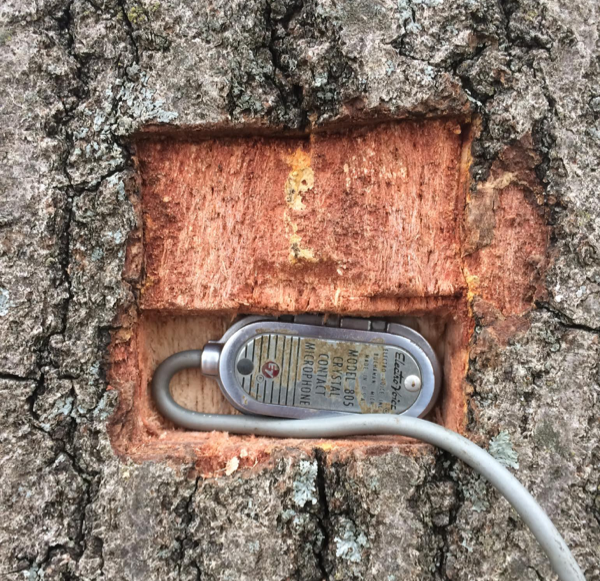 While entire trees are assessed using sound with equipment such as Sylvatest Duo and Treetap, the acoustic qualities of individual standing trees are the focus of Silviphonic interventions that use the conduction of audio through living trees as a basis for audio recordings. Recent work by artists Patrick Farmer and Rob Birch features recordings from trees. Patrick Farmer’s field recording Aeolian Trees (2007) is a recording of the aerodynamic properties [and the attendant sonic qualities] of gorse, pine and oak foliage. These recordings document individual tree species across the UK. Rather than providing renderings of forest situations, Farmer’s field recordings document the individual acoustic qualities of trees and foliage when animated by the wind. Farmer’s Aeolian Treesfocuses on trees as the subject of a recording rather than a passive "environmental" backdrop. Robert Birch’s collaboration, part of The One Tree Project (2017), experiments with taking recordings from different surfaces on a single Pin Oak (Quercus palustris) on the Washington University campus in Saint Louis. The One Tree Project examines land use and resource legacy by examining a single oak from the historic pin oak allée on the Danforth campus that was being removed as part of a campus redevelopment (Duffy 2017). Birch’s investigations involve cutting into the tree bark and embedding an ElectroVoice model 805 crystal contact microphone, a microphone historically used for recording insect activity in trees. The sounds documented by Birch are the results of “playing” the surface of the pin oak with a mallet, handling the tree surface and speaking into a hole bored into the bark (Birch 2017).