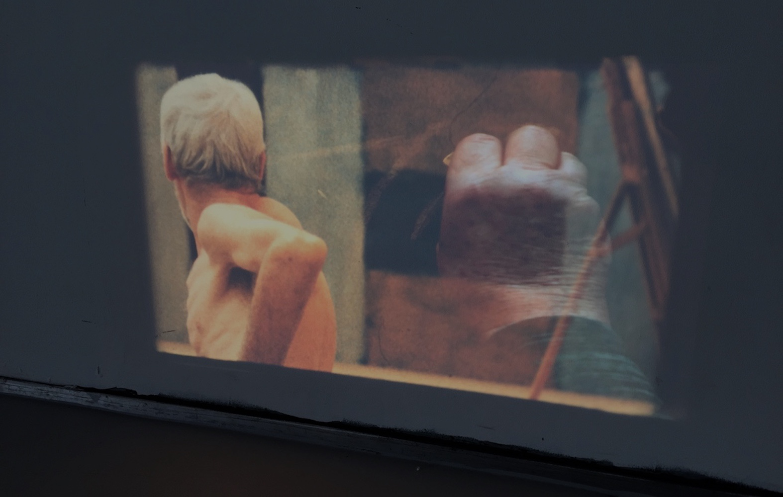 Although all of the content was captured simultaneously on both formats, the exhibition of this project took inspiration from Piccadilly Circus and divided the shots, so that audiences would be encouraged to look between formats. I chose to only include Super-16mm close-up shots, which featured details of the model straining as he held his pose. By contrast, I used digital shots that only featured the class and their drawing process through a mixture of compositions. This was intended to give an impression of the overall activity though an intersection of the two formats.