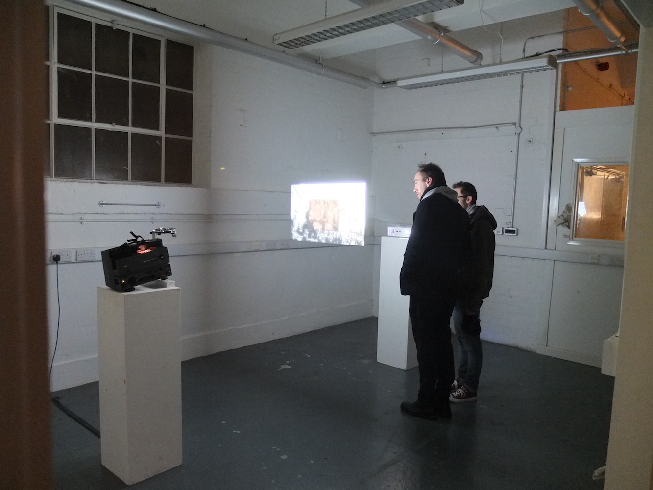 Taking cue from a previous limitation, I felt it was necessary to create a project that would display these different formats in their original medium, rather than undergo a telecine process to digitise the analogue material as in the case of Camera/Projector. While considering how I could interpose two moving image formats in this way, Anthony McCall’s work became a key point of inspiration, particularly Line Describing a Cone (1971), which foregrounds the beam of light emitted from the projector and in so doing prompts an audience to turn their back on the projection screen. McCall achieves this by exhibiting his work in intentionally hazy environments where particulates around the exhibition space emphasise and make visible the throw of light emitted from a projector, encouraging audiences to move around the space.