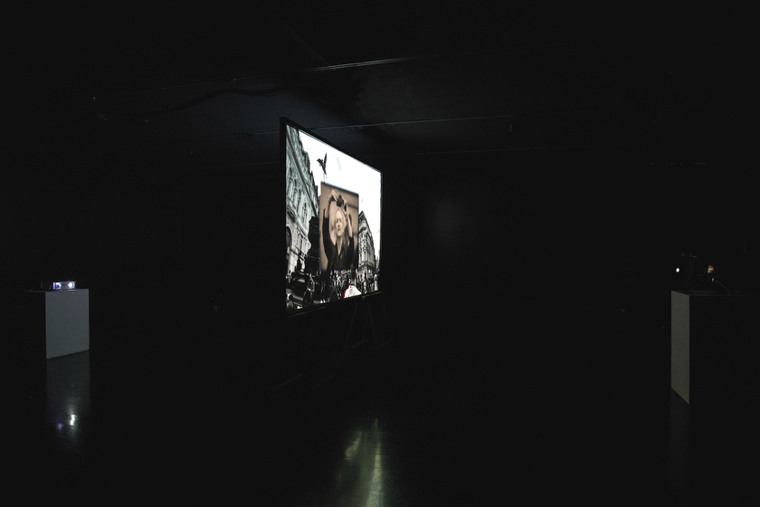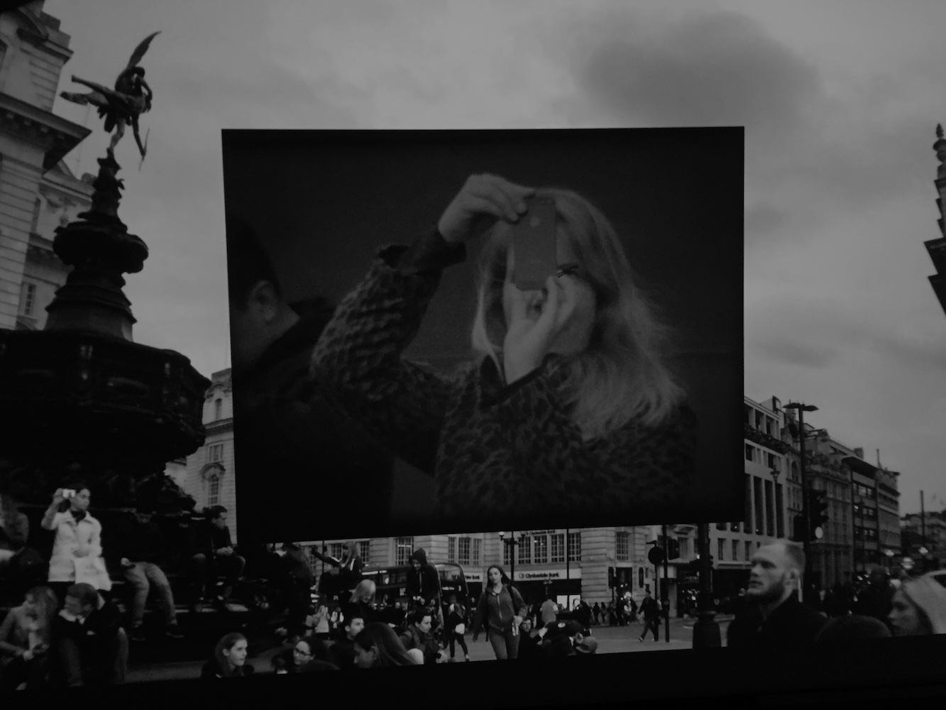 This installation combines Super-8mm and HD digital projection to create looped imagery of Piccadilly Circus (one of the most photographed sites in London). The digital content in the outer area of the screen establishes the bustling public space and shows its crowded inhabitants from afar, while the film image in the centre of the screen depicts individuals in close-up, showing their interaction with the environment through photographic acts such as smartphone selfies and holiday snaps.