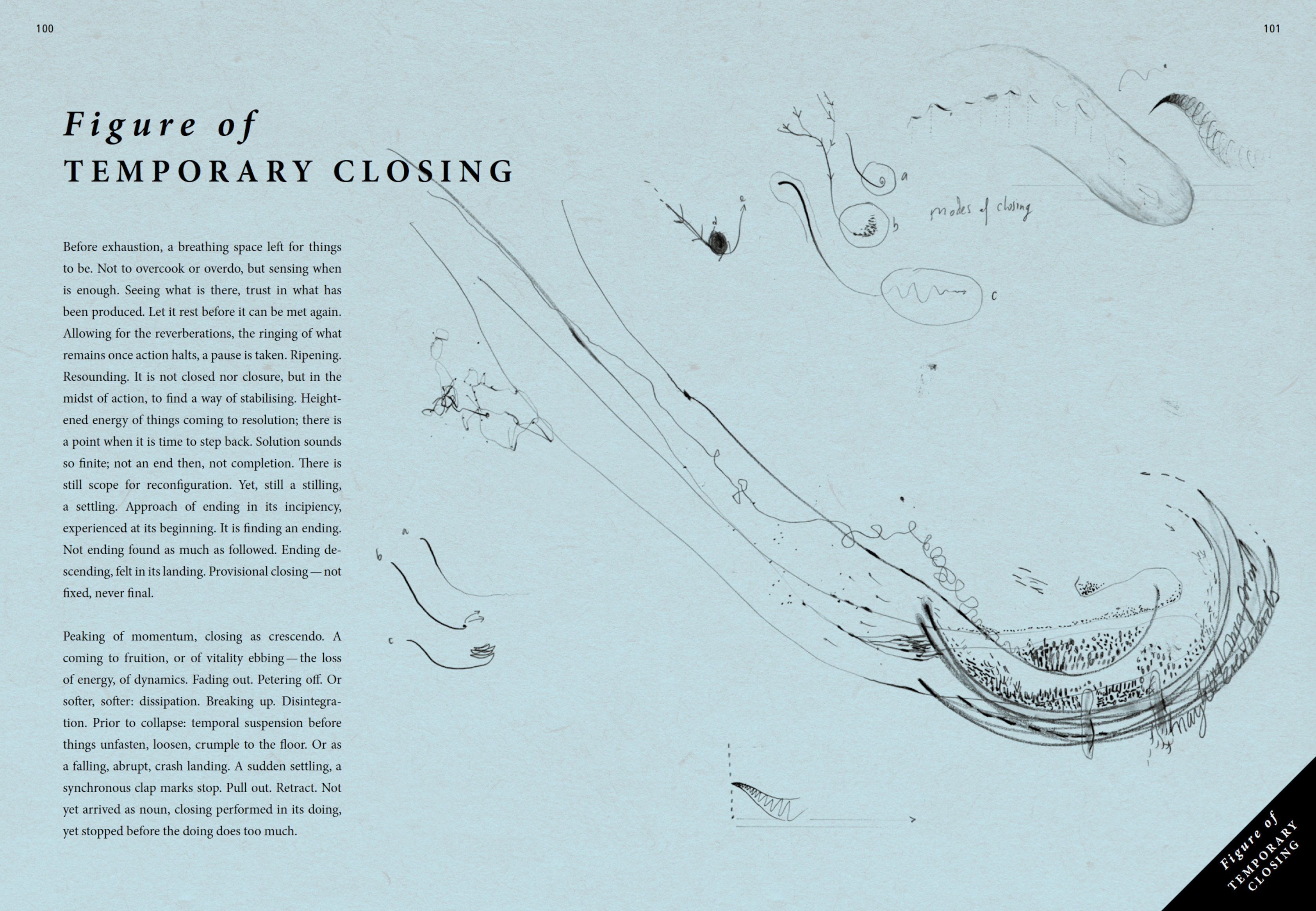 See ‘Figure of Temporary Closing’, in Choreo-graphic Figures: Scoring Aesthetic Encounters, Journal of Artistic Research, Issue 18, 2019 [link here] for an assemblage of audio-visual ‘documents’ showing some of the singular examples of this figure in action, the live(d) experiences that the practice of conversation-as-material attempts to reengage, distil and enliven through language.