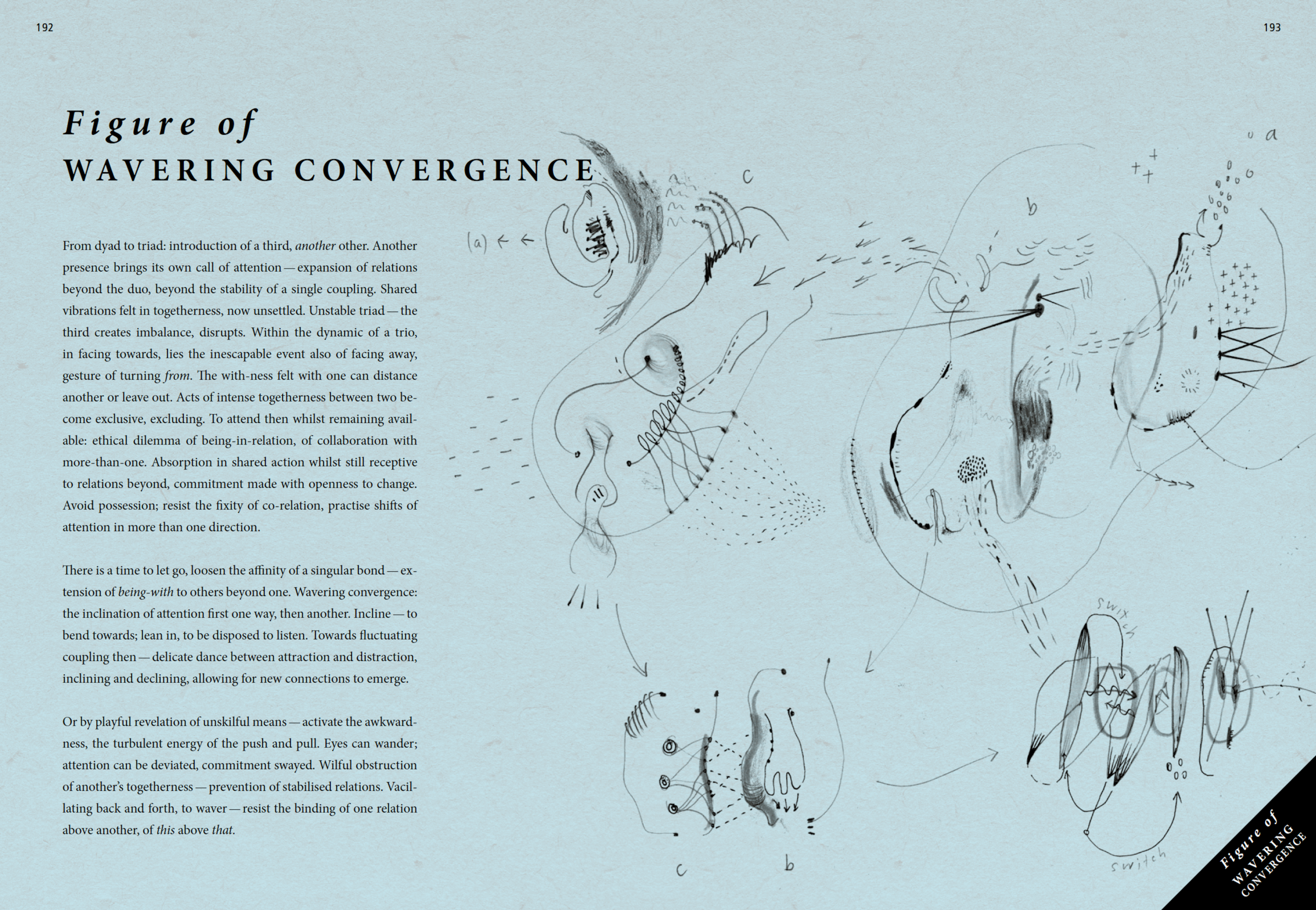 The Figure of Wavering Convergence is one of several ‘figures’ identified and named during a sustained period of collaborative live exploration (involving various studio-based improvisatory and performative practices) within the frame of the artistic research project Choreo-graphic Figures: Deviations from the Line (2014 - 2017). This ‘figure’ is recognized as the dynamic of constantly shifting attention and connection experienced within a triadic model of collaboration, where the intensity of the one-to-one relation (see in Figure of Vibrating Affinity) becomes unsettled by the presence of a third attractor/distractor.