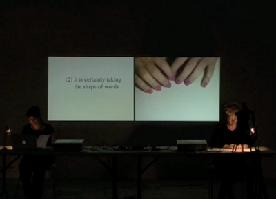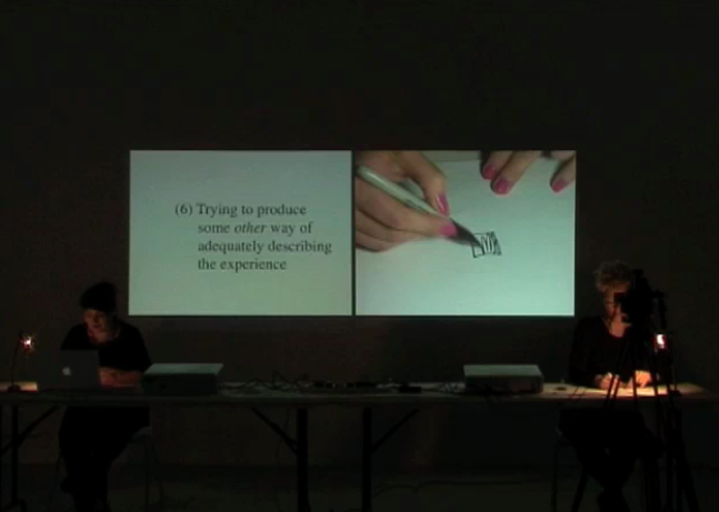 5. Documentation of the performance lecture. The actual performance lecture comprised two parts: Part 1: Two distillations of a conversation were presented side by side. One mode of distillation involved a live reading of the textual distillation that was ‘condensed’ from the original conversation transcript (See 1 for the script). A second mode of distillation involved a visual-diagrammatic tabletop performance – a diagram drawn, a finger pointing – that was simultaneously filmed/recorded and projected live. In turn, this projection was presented adjacent to a series of textual fragments – creating moments of connection and disconnection with the spoken and shown components. Part 2: Following the live-performed section, the recorded material from the live performance was re-presented directly, but where the material was encountered without the spoken word component. The documentation presented is from the second part of the performance lecture, as documentation was not made of Part 1.