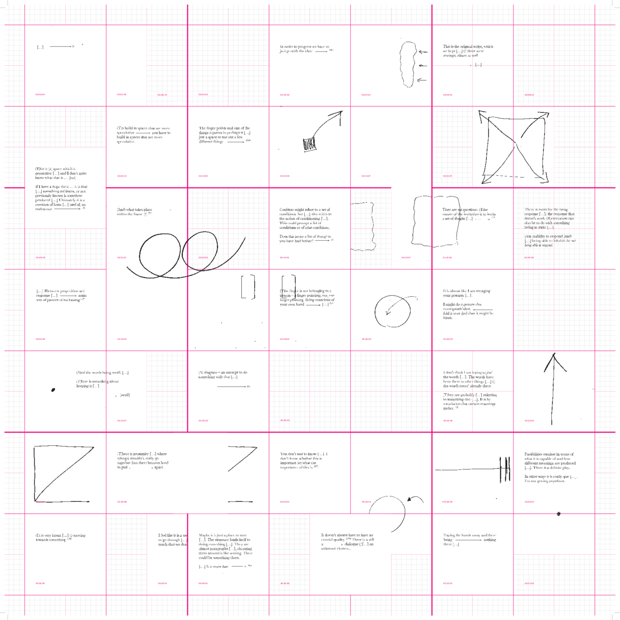 This exposition shows the distillation of conversation transcript into a poetic, vocative text. However, within Re— the text itself has been presented visually, graphically, temporally, relationally, performatively, through performance lectures, moving-image installations, and various kind of scores.