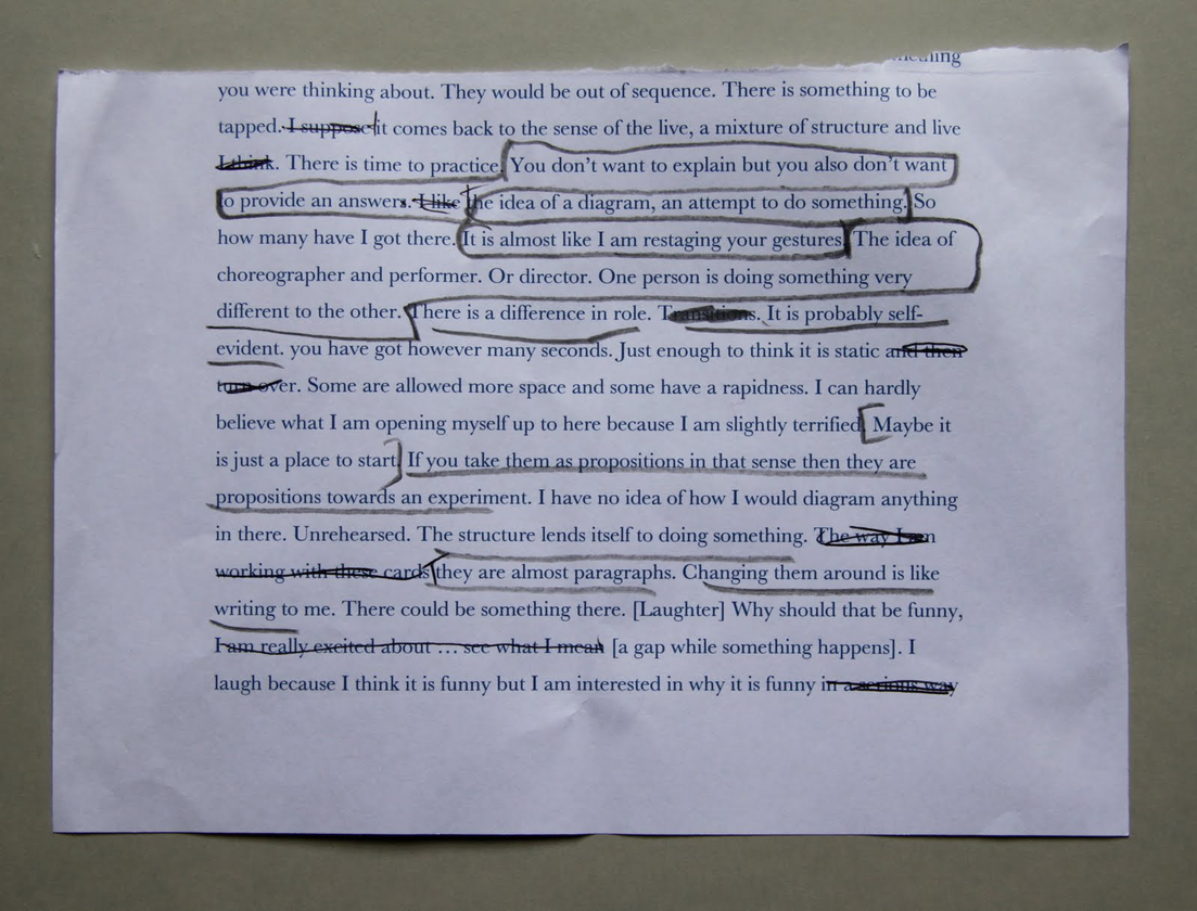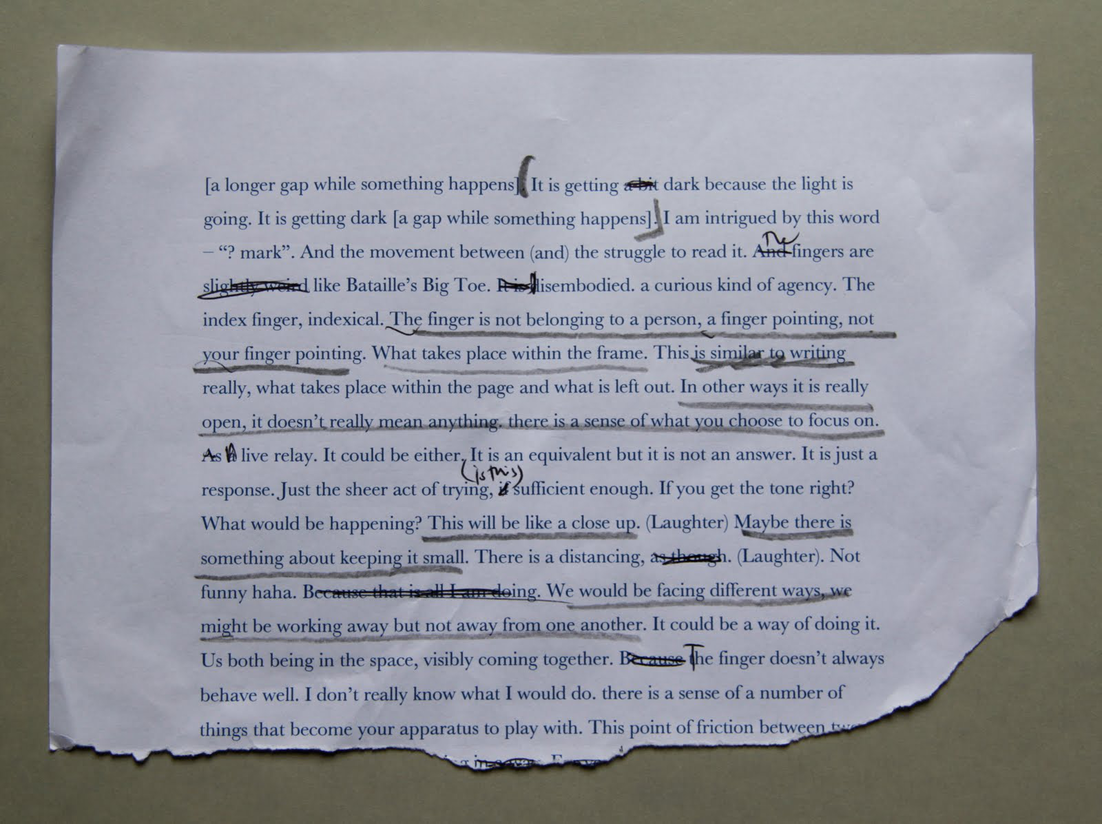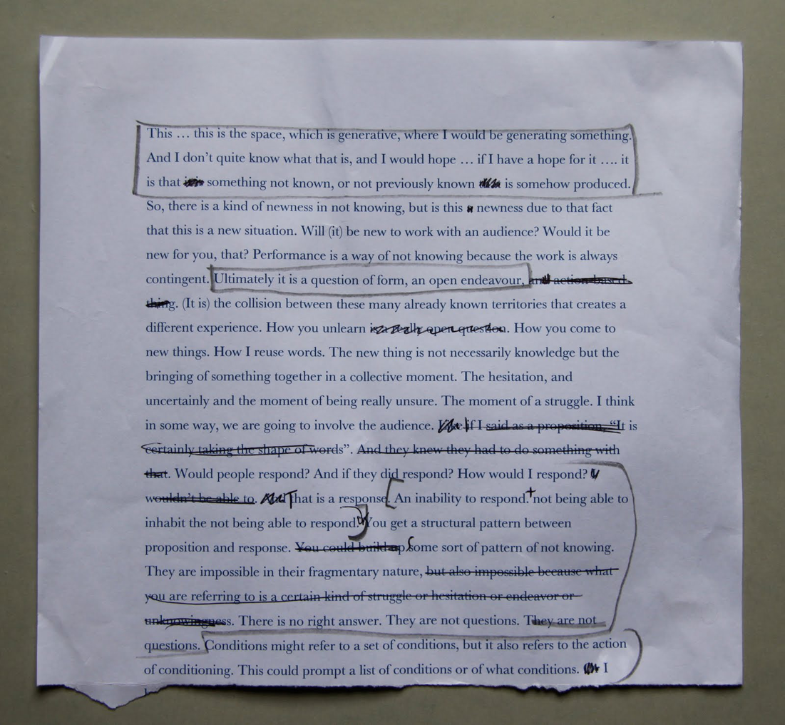 Not knowing … how can something … how can something new be provoked […] (T)his is the space which is generative … generating something. And I don’t quite know what that is, and I would hope … if I have a hope for it … it is that I hope that that something not known, or not previously known is somehow produced. I am interested in the idea of not knowing theoretically, but what if something came about which really genuinely addressed that idea, rather than simply regurgitating ideas about not knowing that I already know. If that makes sense? (S)o there is a kind of newness in not knowing, but is this a newness due to that fact that this is a new situation … Would it be new for you, that? […] (P)erformance is a way of not knowing because the work is always contingent. Ultimately it is a question of form for me and that is why I am drawn to performance, because it is … an open endeavor […] It is … contingent and dependent upon interventions from other people, the audience. In terms of whether you can genuinely create something unexpected or new, the danger perhaps or the potential perhaps, is that you bring forty people into a room who have all got their own expectations. Rather than being able to open something out, it is contained by forty peoples’ expectations. Forty peoples’ responses … none of which are necessarily every truly improvised, but all already drawing on their own experiences, things they have done before. Maybe that is the collision between these many already known territories that creates a different experience? How you unlearn is a really open question. How you come to new things? To me it is external … how I pick up things? How I reuse words? It comes to me from the external world. Which isn’t to say that I am a blank, or that I don’t have agency, but that I think the new thing is not necessarily people’s knowledge but the bringing of something together in a collective moment. The hesitation and uncertainty and the moment of being really unsure. […] The moment of a struggle. Like if I said to someone, as a proposition “It is certainly taking the shape of words” … and just let that hang. And they knew they had to do something with that. It might not necessarily feel significant to them […] Would people respond? And if they did respond? How would I respond? Perhaps, I wouldn’t be able to … Well, there is that, and that is a response. An inability to respond. Would I be able to inhabit the not being able to respond … would it be flat, a nothing? How would that sound though … how do you feel about the ground? I am sorry I can’t answer that question. Or just Urrr. But I think that when you string those together, that for me is where you get a real structural pattern between proposition and response […] Then you could build up some sort of pattern of not knowing […] (W)hat you are referring to is a certain kind of struggle or hesitation or endeavor or unknowingness. I think it is really important to stress that there is no right answer. These are not questions, and I suppose that this is the difference. They are not questions but conditions […] Conditions might relate to a set of conditions, but it also refers to the action of conditioning. It conditions. This could prompt a list of conditions or of what conditions […] The nature of the invitation is to invite a set of thoughts to occur … as a response, as a re-sponse. Maybe we could take some now […] It is all here, all at the top of your head … This is a really interesting place, in terms of improvization, because it’s shallow. It’s light, but there is often something in that. I suppose my reluctance, I guess, is that what this would do for me … what I want it to do, what I want it to provoke is something new or a different way of thinking about something, and I am conscious that my immediate response might be to try to recall, to re-call the context. Those thoughts I have had before. I know what those words might be […] (T)his is the thing about collaboration, or about having a totally new encounter with an audience member … There is room for the boring response as well, the response that doesn’t work […] As a live encounter or coming to the invitation that would be used in a different way. (I)t is in the moment of interaction, of interacting with someone [...] the relationship of producing the new or creating a rupture. (T)he live interaction and the promise of improvization is one of rupture of how you thought about things before. I guess, though, I wonder whether this only presents the rupture and not the new. Someone asks you something or presents you with something incomprehensible, or that you can’t get your head around. Is this interesting to present? (D)oes the new train of thought require space and time and a different kind of attention? […] (T)he encounter of an impasse, or a rupture, or ‘I don’t know’. Perhaps there would be no sense of something new, I would not be able to generate something […] I think it is less about thinking the new, rather than just opening yourself up to the event. Opening yourself up to the possibility of something just being interesting […] Less whether it is new, because the newness will come out of doing it … Doing is a mode I find myself in. (I)t has taken time to cultivate a sense of not trying to criticalize everything in advance of it being made […] for new things to come into being. The thing you said about not knowing, the thing of trying to genuinely apprehend an idea without falling back on things that have already been said or known … There is already a rhetoric of not knowing. It would feel interesting to do something that is not simply rehearsing the rhetoric. The rhetoric of not knowing. You mean that this is somehow dealing with the rhetoric of not knowing already […] There is already an emergent, even established set of theoretical ideas, around or about the idea of 