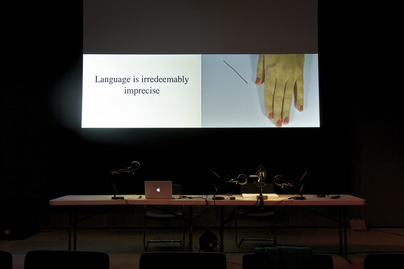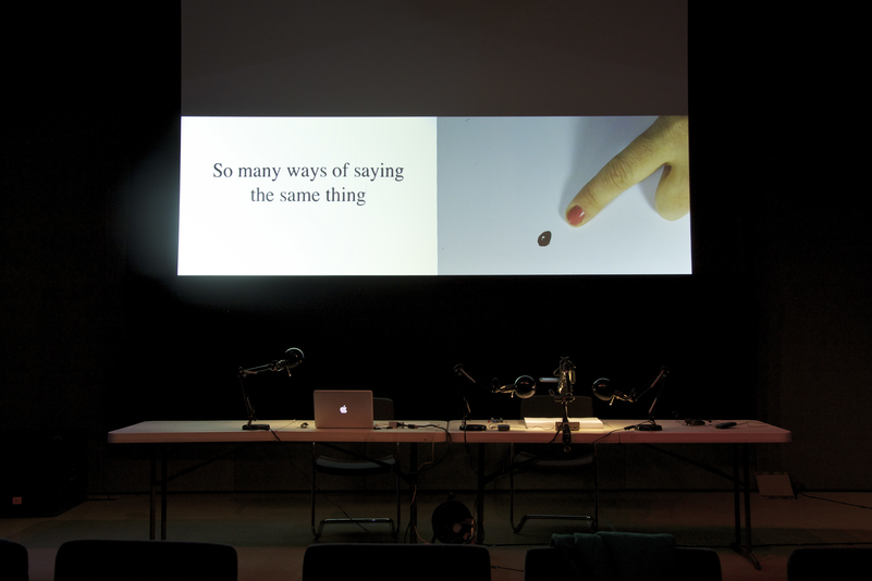 5. Documentation of the performance lecture. The actual performance lecture comprised two parts: Part 1: Two distillations of a conversation were presented side by side. One mode of distillation involved a live reading of the textual distillation that had been ‘condensed’ from the original conversation transcript (See 1 for the script). A second mode of distillation involved a visual-diagrammatic tabletop performance – a diagram drawn, a finger pointing – that was simultaneously filmed/recorded and projected live. In turn, this projection was presented adjacent to a series of textual fragments – creating moments of connection and disconnection with the spoken and shown components. Part 2: Following the live-performed section, the recorded material from the preceding live performance was re-presented as a projection, where the material was encountered without the spoken word component. The documentation presented is from the second part of the performance lecture, as documentation was not made of Part 1.