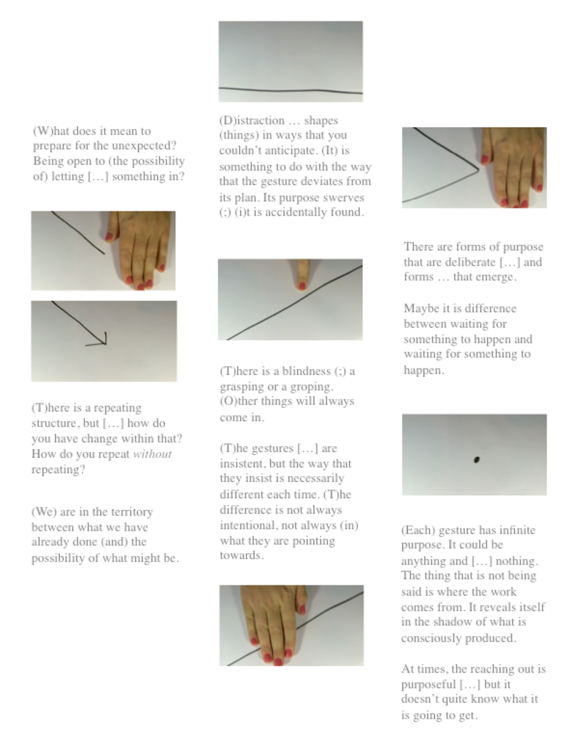 I don’t think we should put too much pressure on. Sometimes it is the point where you are trying to work something out; something through [...] It is hard knowing where to start ... not wanting it to feel too prescriptive. There are particular questions that might come out of the context. What are the recurring problems that we see as our issues? There is a sense of us wrestling with the practice of practising and writing and performing and thinking … and within this there are a set of struggles and obstacles, whether we are aware of them or not ... It does seem to be something to do with this. What are those repeated problems? Maybe we leave this in the air and come back to it. No, I think that this is an interesting place to start. There is something else inside the work ... There is a point to the work other than itself and its own making ... It is how rather than the what and the why. So how are the repeating problems? It is more of a poetic concern ... It is much more about how to get to the point. Whatever the point is ... but the point changes [...] The question of how do you repeat without repeating? The structure gives a sense of freedom ... to flex in the middle or flex in terms of content [...] We are talking about something that is quite particular to our own practices, or maybe to practice. The gestures can’t be repeated. They are insistent, but the way that they insist is totally different each time. (T)here is a grammar; there is a punctuation of these movements. And I don’t just mean that they can’t be repeated ... but that they are necessarily different each time. It is impossible to be exact in a way. There is a sense of endeavor ... it is different every time because there is a limitless vocabulary. They are two very different performances ... they mean quite different things. They speak to quite different concerns because of the specificity of the context [...] They are both getting at something. It feels as though the difference is in the intention? But they differ in the context and in terms of what they are intimating towards. The index finger is interesting in the ways in which it is used — the gestures remains the same, but the intention radically changes ... The work rests on what is latent and what is not said. It is a trying; it is a testing of that particular way of speaking — the index is the speaking finger. And in many ways, what it is saying is quite loud [...] It is trying to get over what it might mean to other people as well ... that is the experiment. Focusing down on that. We are in the territory of what we have already done, and there is something in the work where there is a moment where you pass into the possibility of what it might be. It is really a very fragile line. I am not sure where that happens … It may well have already happened but we can’t see it. Speculation is dynamic, hesitation is movement, and knowledge is on the move — all of these things. This notion of groping for something, perhaps that you never get towards ... never getting to the thing that you are groping for. Maybe it is the difference between waiting for something to happen and making something happen. I think that the work exists at the threshold — at times it is waiting for something to happen and at other times it feels as if it is putting pressure on, to force it in some kind of way [...] It rests on the relationship between those two modes. How do you repeat without repeating? Or it just shifted the vocabulary in a way that couldn’t have been anticipated. And in a way we are preparing for something to happen. We are getting ready for it to happen. What does that mean? What is that? The preparation composes what will happen and shapes it. The nature of the invitation is key. What I am doing — it is live, it is happening, it is of the moment, it is very felt. It has a framework ... there is a conversation, there is an internal logic. Maybe it needs the frame — for otherwise you are talking about such slight gestures, they just fly away. You need something to spring from in order to show the chaos, in order to show the live. It is not even taking care — it is a form of attention towards something that is so ephemeral. The attention — without that, without that frame, it is very gaseous or easy dispersed or not seen in a way. It is about attention, the attention that we are bringing, the focus that we are bringing on the hands and on the script [...] The closer you get, in the close ups, you get more … you get closer but you don’t necessarily get any more. The closer in it becomes the less readable it becomes somehow ... there are a lot of full stops. It involves a focusing … It needs to be as exact as possible, and there is so much when you get in there. It gets smaller and smaller, in many ways [...] Going back to this repeating problem of how do you repeat without repeating? This is a distillation process. A sense of the perpetual distillation of the same content, the reduction and reduction [...] It bleeds [...] Distraction that comes in sideways and starts to shape things in a way that you ... couldn't anticipate. What might come in from the side? This sense of a deviant aspect — where momentarily your attention wanders and settles in a place ... Other things will always come in — new things come in and distract all the time [...] Maybe the focus is really important. It is not a form of distraction that is moving away, it is a form of distraction that is coming in. Trying to keep focused but nonetheless ... aware of these other things. It is an engagement ... a felt engagement. How would that work in terms of repetition? It is thinking through, it is provisional. It is eventual, evental ... It is a bid for feeling knowledge, felt knowledge, as in the felt tip. The penmanship aspect. Felt tip — this whole notion that it is felt, that it is a feeling, a feeling, but it is the tip of a feeling. Whilst you are getting the tip,