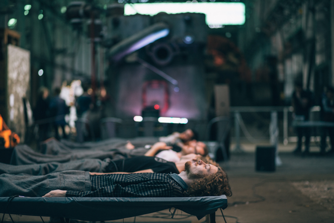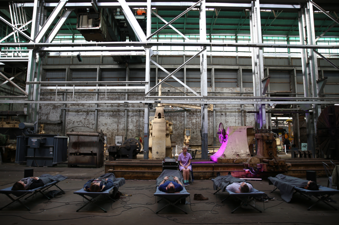 Taking place during a mild winter weekend, the Underbelly Arts Festival was one of many regular events staged on the island throughout the year (including the Biennale of Sydney). Underbelly was spread across the majority of Cockatoo Island, and Relaxation Circuit was installed inside the central Turbine Hall, next to one of the largest lathes in the southern hemisphere that was previously used to create turbines of enormous scale. The dialogue that was developed between the installation and its physical and historical context was critical to how the work was received and experienced. The prodigious machines sitting beside the work provided an important historical reference to the industrialized labor from that same period that Eeman’s work responded to. Looming in the giant hall, long shut down, these motionless machines recalled the noise that played such a part in modernist conceptions of nervousness. This paradox between the concept of relaxation, which was suggested by the title of the work, and its immediate environment proved to be productive for the historical dialogue that the appropriation sought to inspire. Whether or not the audience was familiar with neurasthenia, they were immediately suspicious when asked to lie down and relax in the cot beds and blankets arranged amongst these overbearing steel structures.