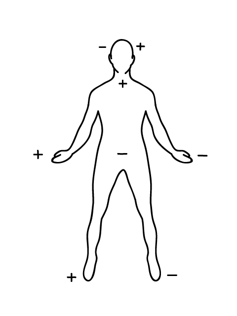 What set Eeman’s work apart from these other electrotherapists was his utilization of the passive circuit. Instead of connecting his subjects to an electric current generated from an external power source, like a battery, he worked on the basis that the body was capable of generating its own charge. Eeman proposed that the body is like a battery, with a cathode that generates negative charge and an anode generating positive charge. In his own way, he carried on from Reichenbach’s Odic forces, explaining that when the body is connected to itself or to other bodies using electrically-conductive wires and plates, in an arrangement that corresponds with these said polarities, the “bodies behave as though using an electro-magnetic analogy – they were bi-polar.” To make use of this charge of “vital energy,” bodies were connected by “three axes: head to feet, right side to left, and back to front, and their detailed bi-polarities follow the known nervous tracts.” These directional forces could be set up to flow in one direction, as a Relaxation Circuit, or in the opposite direction, as a Tension Circuit. Eeman proposed that his Relaxation Circuit promotes “relaxation of voluntary muscles and stimulates functional activity. It fosters sleep, recovery from fatigue and disease, capacity for work and health in general. The tension circuit reverses these more or less. Both circuits affect not only organic but also nervous and mental health” (Eeman 1947: 17).