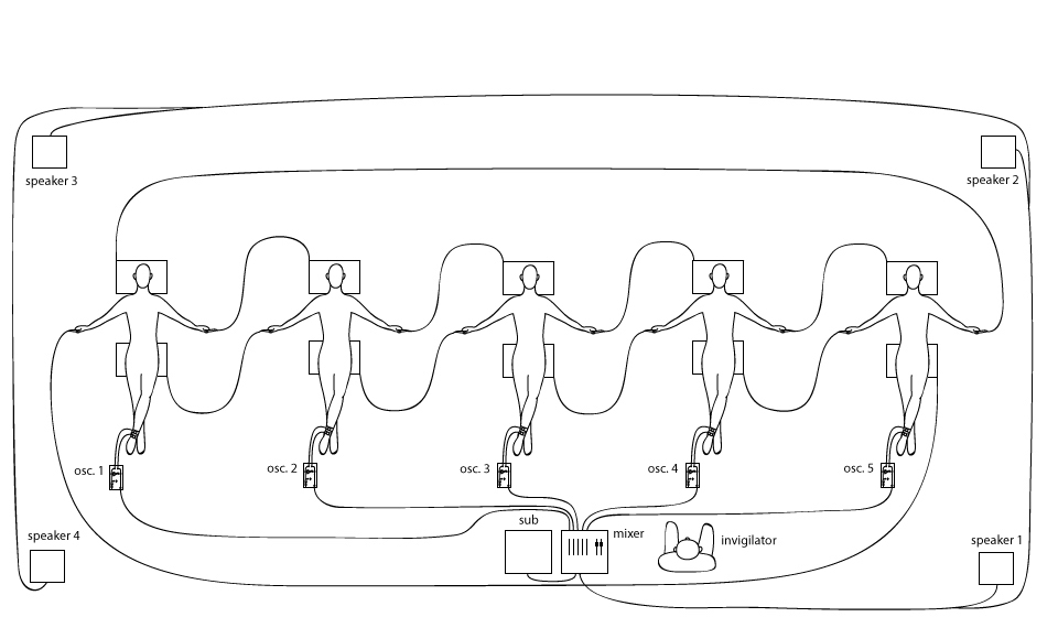 Illustration of Relaxation Circuit, 2015, with five participants. The network of plates and lines connected to head and lower back illustrate the reworking of Eeman’s Relaxation Circuit. “Osc. 1-5” indicate the bio-synthesizer oscillators connected to each participant’s leg.