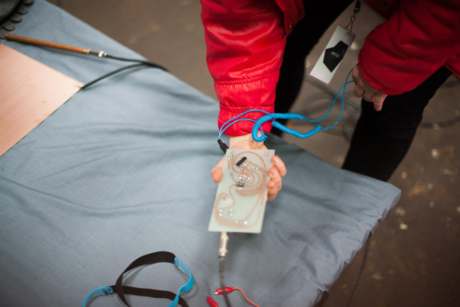 Each session created a chord of sonic vibrations, with subtle shifts and variations that would last the length of the session. Throughout the duration of the festival, it was surprising to me how varied the sonic outputs from the various participants were. Some people seemed to generate obvious stagnant frequencies that would be expected from a passive and restful participant. Some oscillations, however, were entirely lively and unpredictable, while others were incredibly rhythmic, resulting in low frequency rumbles. Eeman’s network revealed itself through the connections between participants, whose movements were able to affect neighboring oscillators as well as their own. For example, during one session a participant placed on one end of the circuit sneezed and disrupted every oscillation all the way down the circuit. The concentration and stillness required to participate actively in this agreed-upon “relaxation session” in the middle of a bustling festival generated a lively reflective discussion on the experience. At the end of the session some time was provided for participants to discuss how they felt as they disengaged from the circuit, and many expressed surprise about their experiences. There appeared to be a natural inclination for people to draw connections between the quality of the sonic oscillations that were generated and their mood, personality or physical state. Many of those who heard unexpected shifts in the sound tried to identify what had happened, while often these had occurred without any traceable movement by the participants. Some participants, as Eeman had warned, did, in fact, fall asleep during the session.[19] A small handful of people expressed that the sound did not help them relax; instead, they felt more stressed and anxious than they had been before engaging in the circuit.