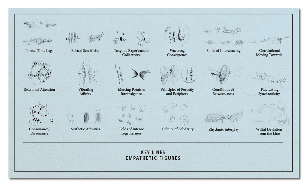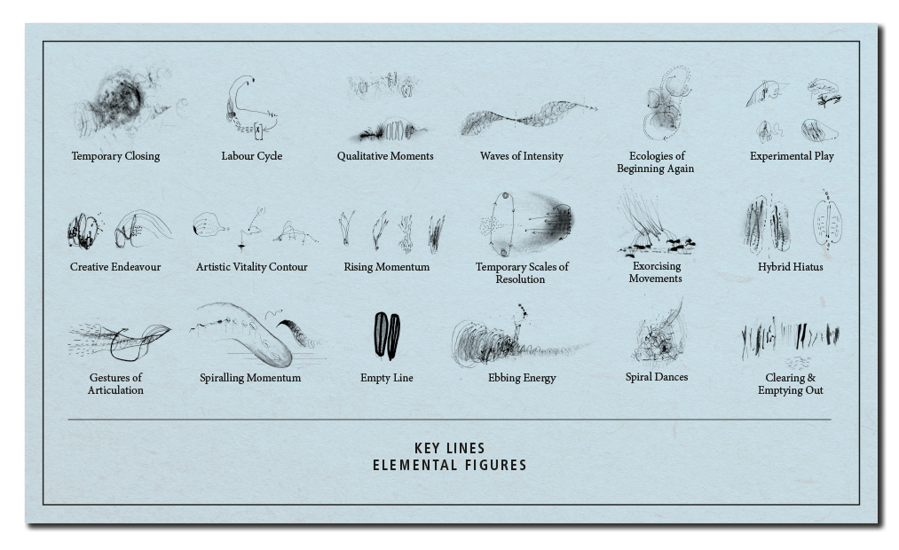 Within our investigation so far, we have been able to articulate the qualities and constitutive conditions for nine named figures out of a list of infinitely more. In turn, these figures have been grouped according to three different qualitative categories. The Elemental Figures diagram key moments within the arc of creative exploration or endeavour, address the opening up and exposition of process. The figures we present within this grouping are indicative not exhaustive, referring to just three moments within the arc of practice: the process of beginning (→ Clearing and Emptying Out), of generating energy in the midst of (→ Spiralling Momentum), and for drawing towards resolution (→ Temporary Closing). The Empathetic Figures involve the diagramming of relations, drawing attention to the ethics of collaboration, the sensitivities and sensibilities of being-with. The three figures presented (→ Vibrating Affinity, Wavering Convergence, Consonance / Dissonance) articulate a shift from the experienced intensity of being-with one to the many, or rather from the experience of the one (that is already the many) to the multitude. The Transformative Figures each involve an explicit shift, change or even transformation in property, quality or state of being. Connected through the prefix trans- (indicating movement across or through, the act of ‘going beyond’), the three figures presented (→ Ventilating Meaning, Becoming Material, Translational Flux) each involve the dissolving or destabilising of fixed meanings by collapsing the lines of distinction between activity / passivity, animate / inanimate, subject / object, self / world.