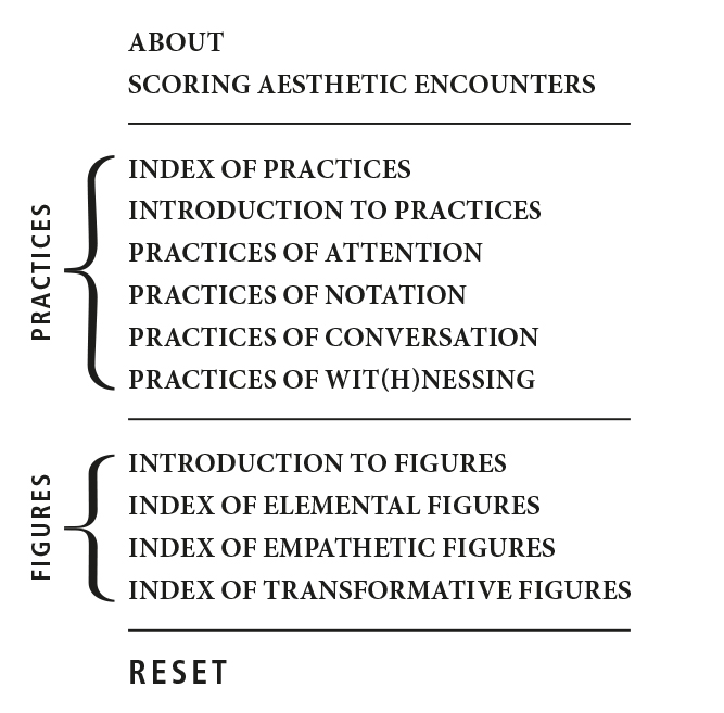 [ii] Practices: in conjunction, we have developed a set of practices for sharpening, focusing or redirecting attention towards both the event of figuring and the emergence of figures (→Introduction to Practices, →Index of Practices, →Practices of Attention, →Practices of Notation, →Practices of Conversation, →Practices of Wit(h)nessing).