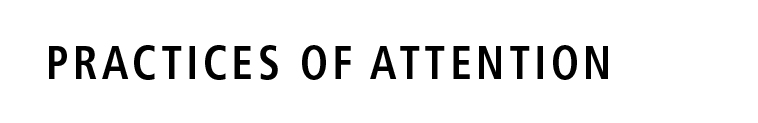 The Practices of Attention perform a vital role within our artistic research process, creating the germinal conditions for experimental aesthetic enquiry. They enable us to access states of increased alertness, vigilance and receptivity, in turn augmenting (heightening, deepening, widening) and nuancing (sharpening, refining) both our individual and our collective sensitivities to the vitality dynamics and affects within our live exploration. Related to — though significantly different from — warming-up activities, there is a preparatory function to the Practices of Attention. They have a re-set or re-tune task, clearing the ground in order to see things differently[1]. They involve a process of letting go or emptying out — activating a level of awareness beyond the utilitarian, instrumental, or judgemental; the temporary suspension of will or self-led agency towards increased receptivity, even passivity. Here, passivity does not lead to inaction, but rather gives way to a truly spontaneous mode of intentionality; intention without a predetermined direction or destination. Not yet towards something. Freed from conscious expectations or goals, these practices invite a quality of defocussed focus akin to a state of ‘evenly suspended’ or ‘hovering’ attention[2]. Attention practices are radically non-creative, or rather they wilfully constrain self-expressivity, opening up a‘gap’ for creative attention, for the immanent and open-ended vitalities of creation to arise[3]. Whilst these practices increase our capacity for noticing, the invitation is to not (yet) follow the impulse, nor is it to mark this event as such (→ Practices of Notation). Just attend. In this sense, the key modality of these practices is re-generative non-productivity.