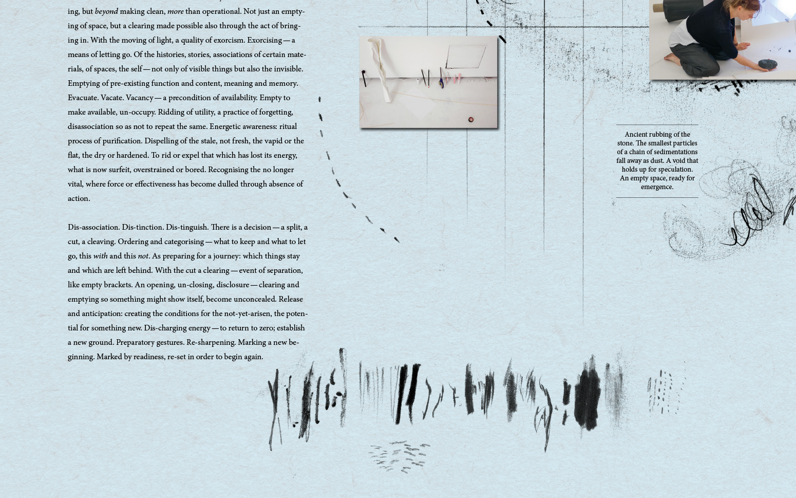 We have developed this exposition for ‘scoring an aesthetic encounter’ with the multimodal (visual, textual, sonic, performative) findings from Choreo-graphic Figures: Deviations from the Line, an artistic research project by Emma Cocker, Nikolaus Gansterer and Mariella Greil. Choreo-graphic Figures stages a beyond-disciplinary encounter between the lines of choreography, drawing and writing, for exploring those forms of knowing-thinking-feeling produced in the slippage and deviation when different modes of practice enter into dialogue, overlap and collide. Within this exposition, our aim is not to present an exhaustive account of the Choreo-graphic Figures project. Rather, we seek to test the specificity of this online context for extending our investigation through the following questions: how can we create a digital archive capable of reflecting the durational and relational aspects of the research process, a mode of online dissemination that enacts something of the liveness or vitality — the energies and intensities — within collaborative live exploration? Beyond the limitations of the static two-dimensional page, how can an enhanced digital format enable a non-linear, rhizomatic encounter with artistic research, where findings are activated and navigated, interacted or even played with as a choreo-graphic event? We have modelled the exposition on the experimental score system developed within our research project, for organising our process of aesthetic enquiry through the bringing-into-relation of different practices and figures. The score is approached as a ‘research tool’ for testing how different practices (of Attention, Notation, Conversation, Wit(h)nessing) can be activated for sharpening, focusing or redirecting attention towards the event of figuring (those small yet transformative energies, emergences, and experiential shifts within artistic process that are often hard to discern but which ultimately steer the evolving action) and the emergence of figures (the point at which the experience of ‘something happening’ [i.e. figuring] coalesces into recognisable form). Within this exposition, our research can be encountered experientially through → Playing the Score, whilst the → Find Out More section contains contextual framing alongside conceptual-theoretical reflections on the function of our score and its ecology of practices and figures.